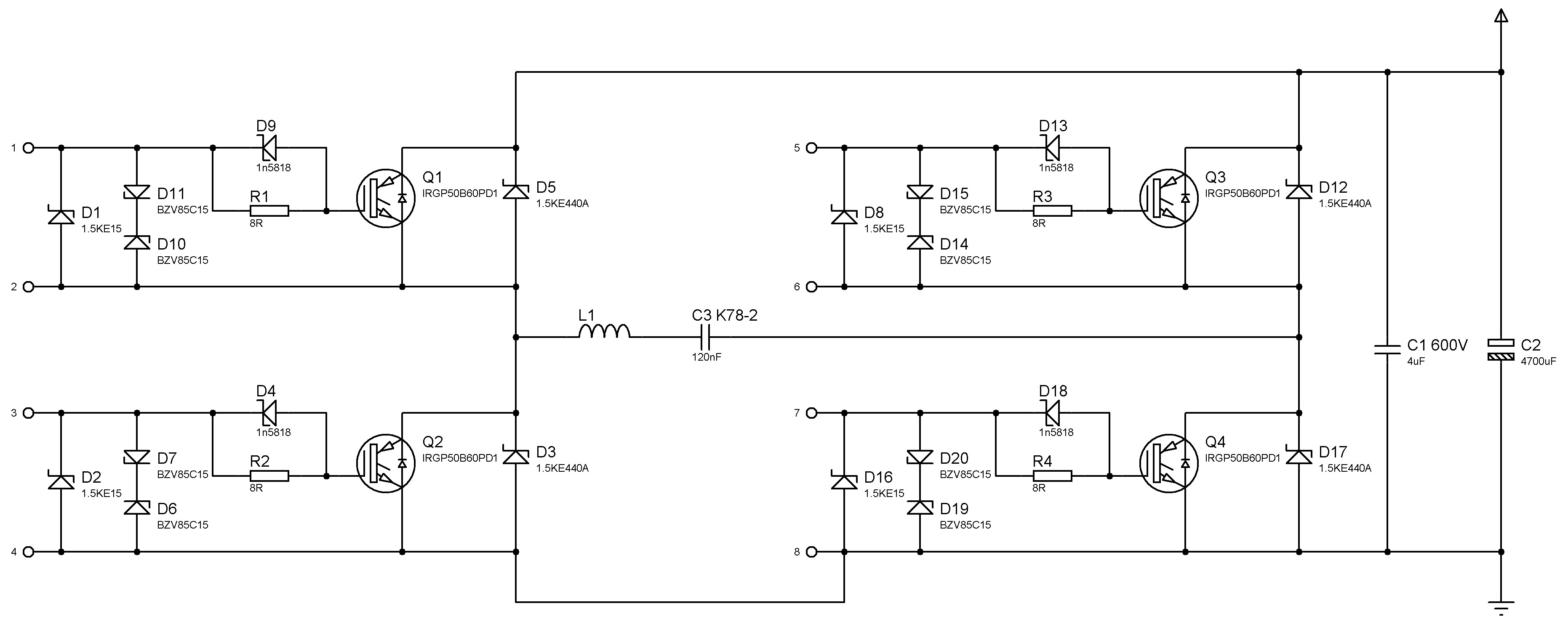 D5,3,12,17-заменить на 1,5ке 440 са и параллельно им по 200 кОм ,а по затвору r2r правильно написал -там нужны сапрессоры р6е24са и параллельно им 470-560 Ом-это если питается двуполярным потдельным питаловом ,а если GDT -то вообще ничего не надо,так как это дополнительные 1-2нана-торможение скорос...