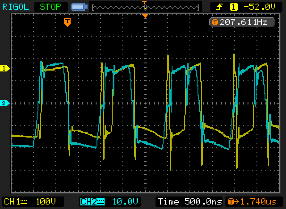 На большую дрку я пока забил, захотелось маленькую оживить, поставил 50б60 в силовую, сделал нормальный драйвер с выходниками на irf7319, прилепил простенький предиктер, чтобы игбт потянули частоту в 700кгц. И тут вылез такой странный баг: NewFile47.png NewFile49.png синее - сигнал с затвора желтое ...