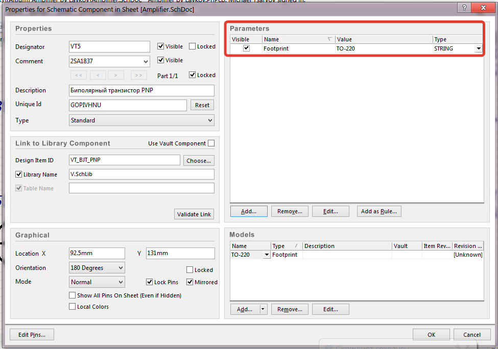 Вы, видимо, меня непоняли. Про такой метод я знаю, туда, вообще, много всякой ереси можно понаписать. Вот представте, есть у вас УГО вашего транзистора 2SA1837. Вы при создании компонента привязали к этому уго несколько футпринтов: SOT-23, TO-92, TO-220. Далее, при построении схемы вы выбираете из библиотеки свой транзистор и, т.к. у него несколько футпринтов привязано к одному УГО, выбираете нужный футпринт. Вот я и хочу, чтобы имя выбранного мной футпринта выносилось на схему.