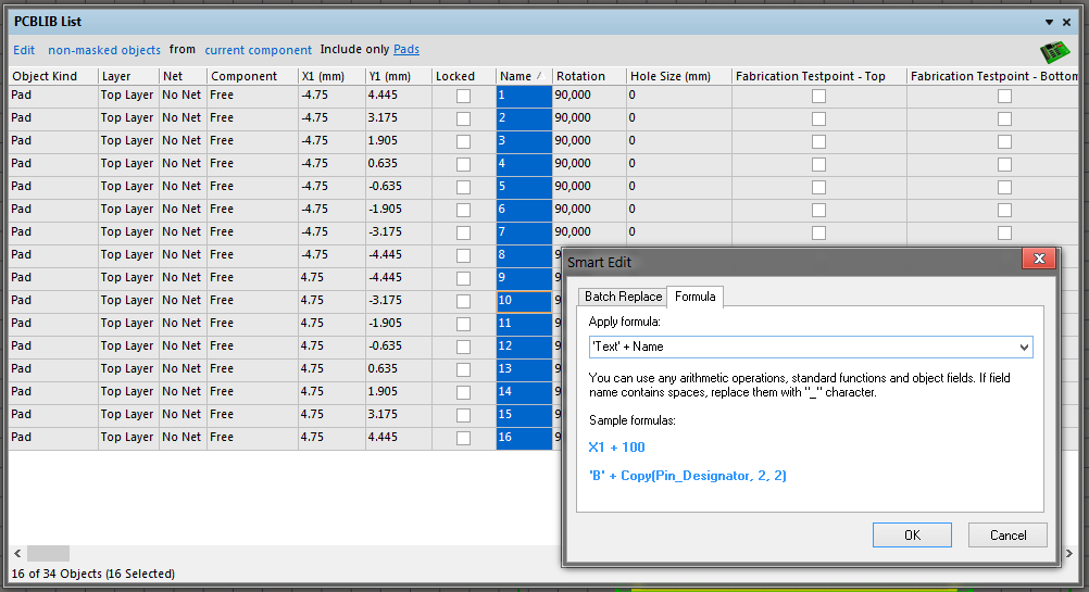 Можно ли задать им правило именования по маске и для пинов и для падов, чтобы, например, было не 1...100, а pa1...pa100, или чтобы именовалось как матрица A1...J10?