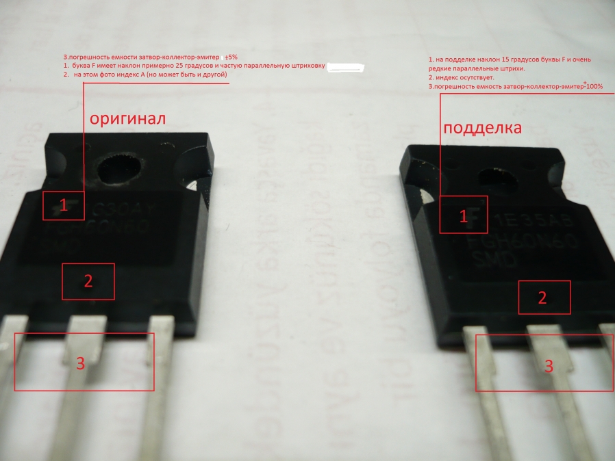 Рельеф тоже отсутствует – это лишь рисунок... Но самая жесть в том, что это даже не один транзистор, который перемаркировывали — среди этих плоских "FGH60N60SMD" могут попадаться IGBT с диодом, без диода, или вообще MOSFET. Иногда рабочие, вполне открывающиеся, иногда попадаются пробитые. Те, что работают — какая-то очень медленная модель IGBT, частоты SSTC/DRSSTC не тянут. Если запаять такие в Теслу — разряда она не выдаст.