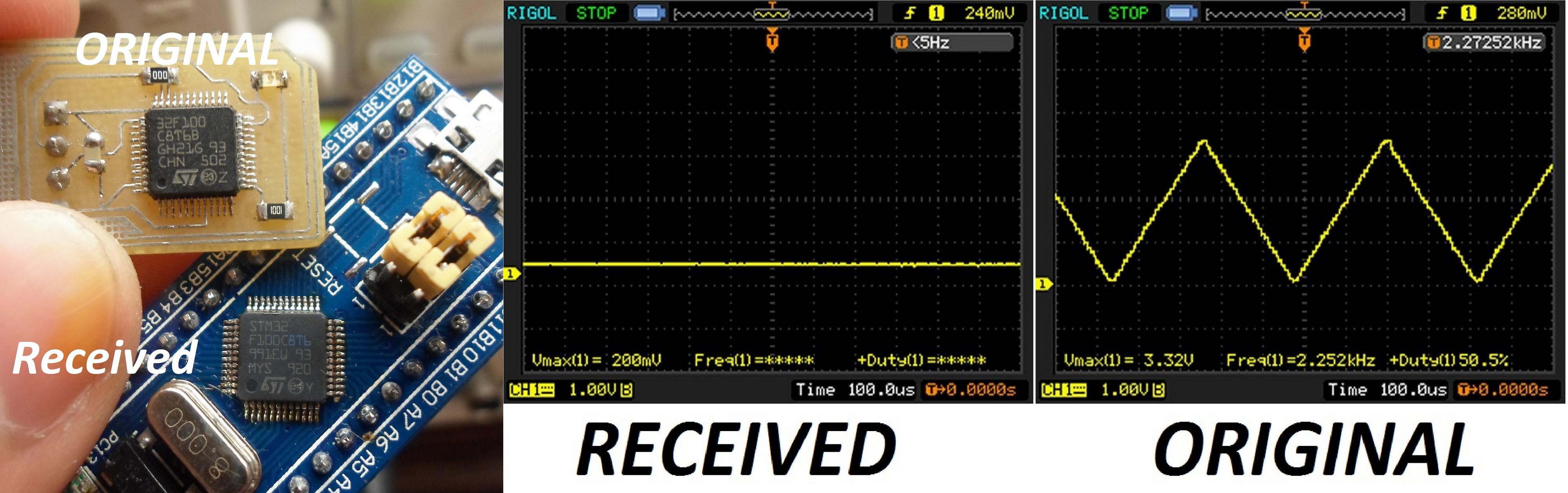 У этих прямо точки на корпусе, будто кто-то проверял и отмечал лажу вручную. В данном случае не работает то ли DAC, то ли DMA — простой тест миганием светодиода проходят.