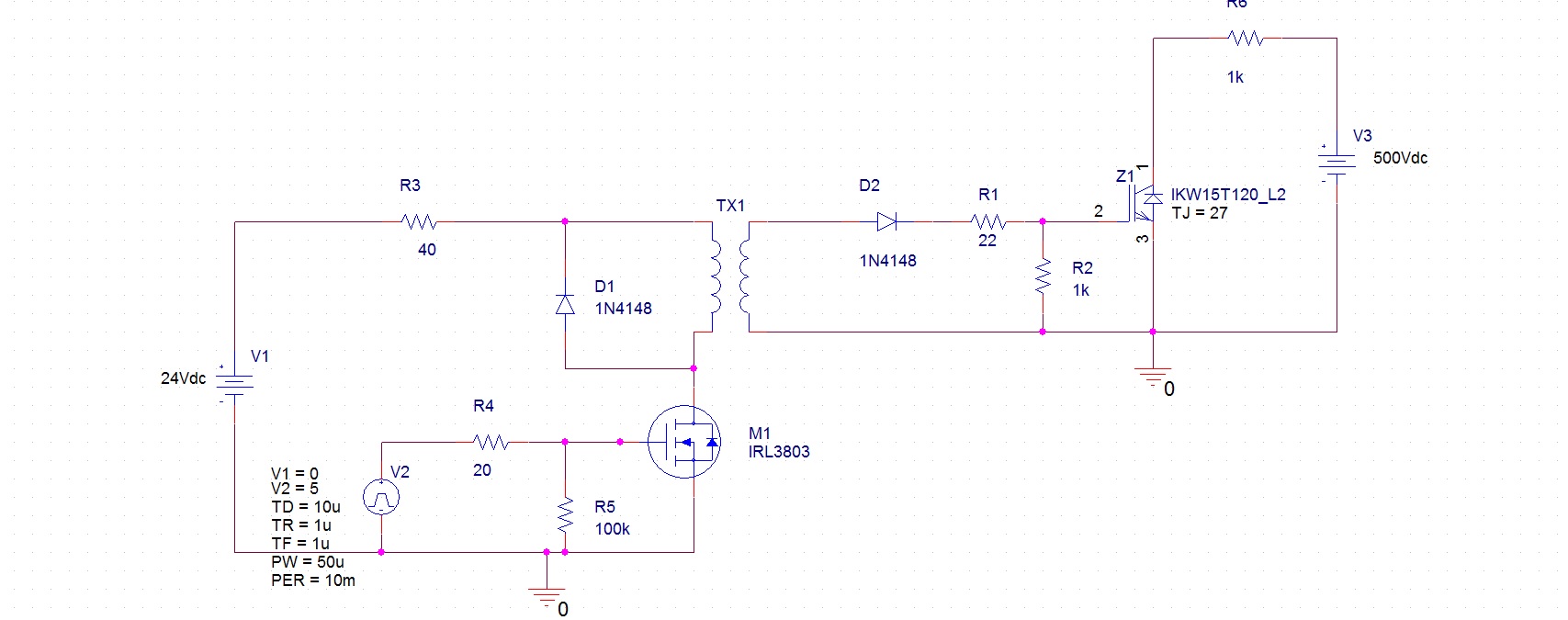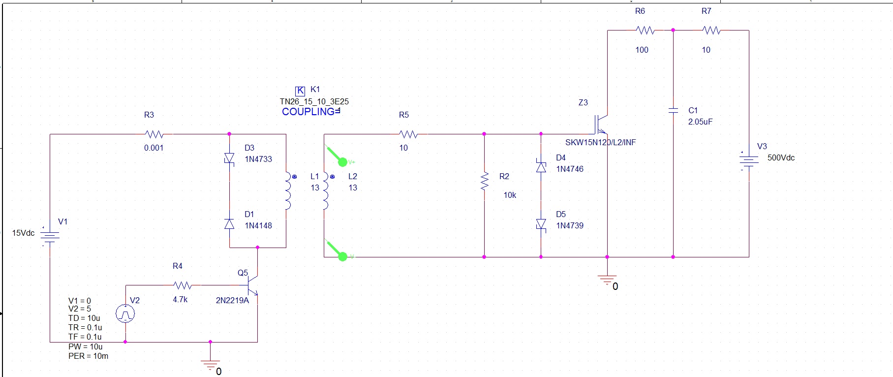Набросал схему управления IGBT при помощи импульсного трансформатора (прикреплено ниже), но проблема в том что в симуляторе работает не так как по расчетах, напряжение на первичной обмотке гораздо меньше чем нужно, хотя уменьшив резистор R3 можна добитяся нужного напряжения. Я так думаю что метод вычислений неправильный (Если нужно расчет могу предоставить).