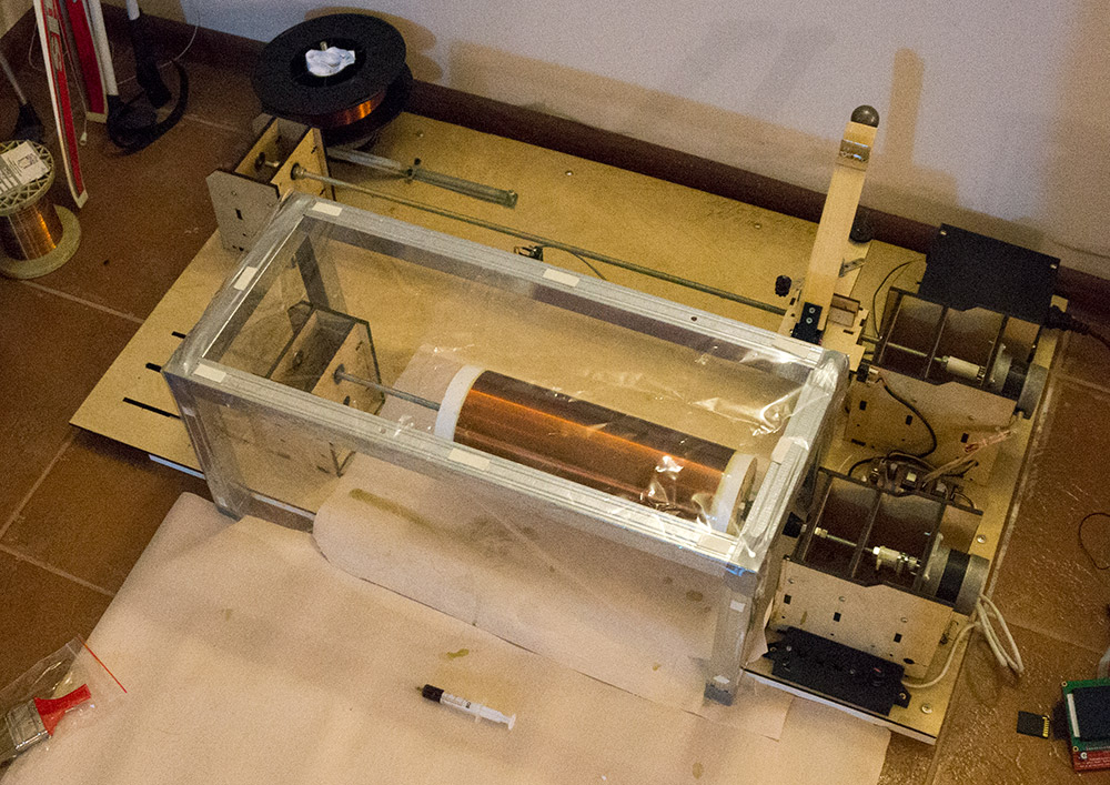 Намоточный станок все апгрейдится и апгрейдится. Из новостей - новый натяжитель, который позволяет плотнее ложить витки и "саркофаг" который защищает обмотку от пыли при сушке.