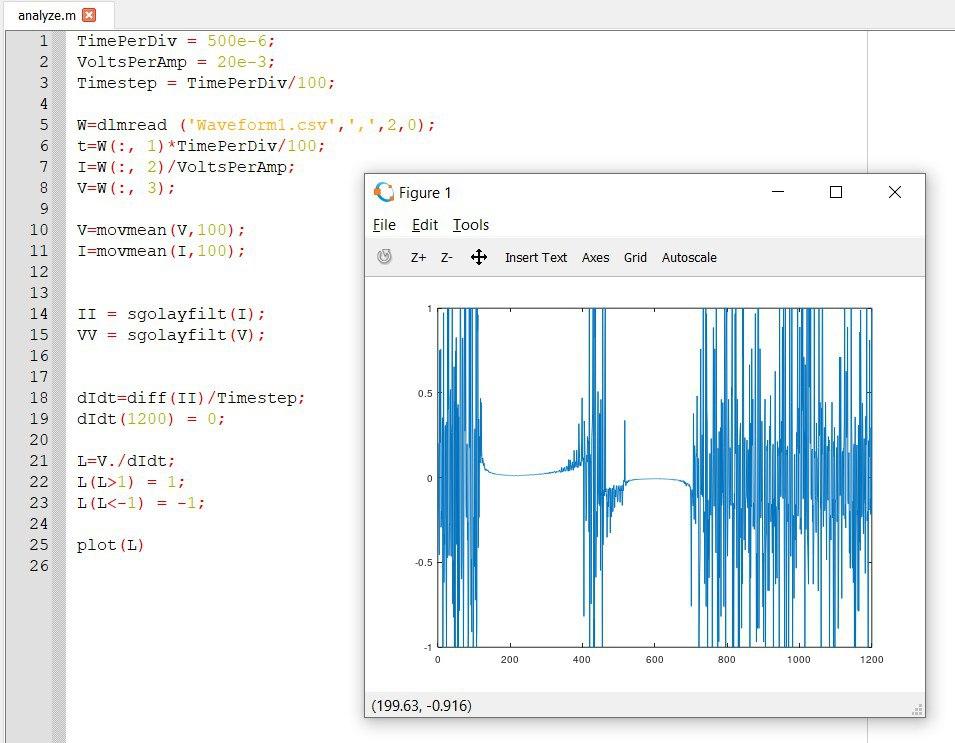 В сигналах слишком много шума. Если кто хочет попробовать придумать алгоритм, то выложу сами сигналы тока и напряжения в виде CSV файлов.