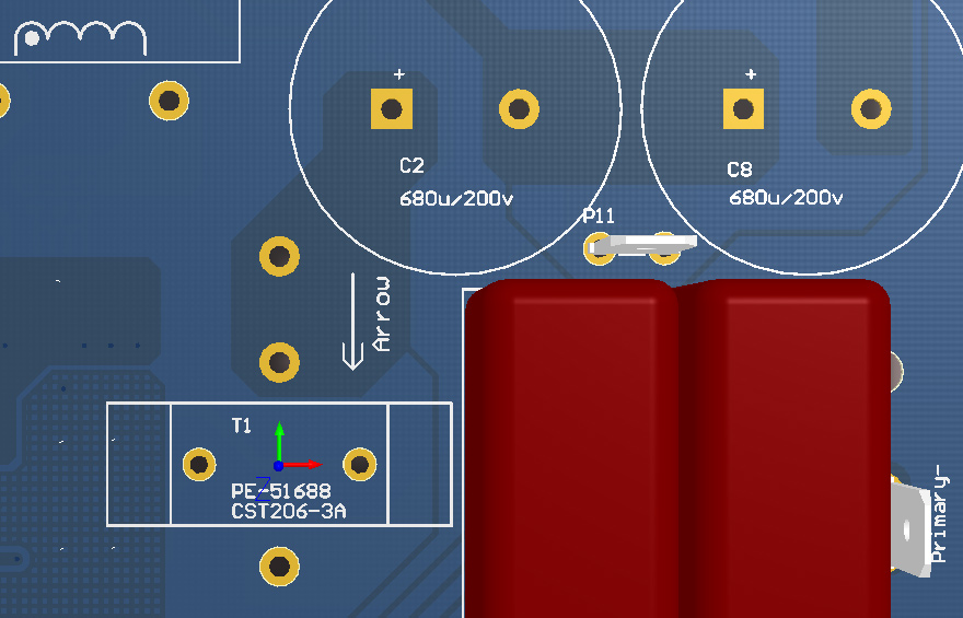 Футпринт нарисовал для обоих трансформаторов - и для CST206 и для PE-51688. Кроме того, сделал еще одно отверстие подальше, чтобы можно было трансформатор защиты по току туда впихнуть.