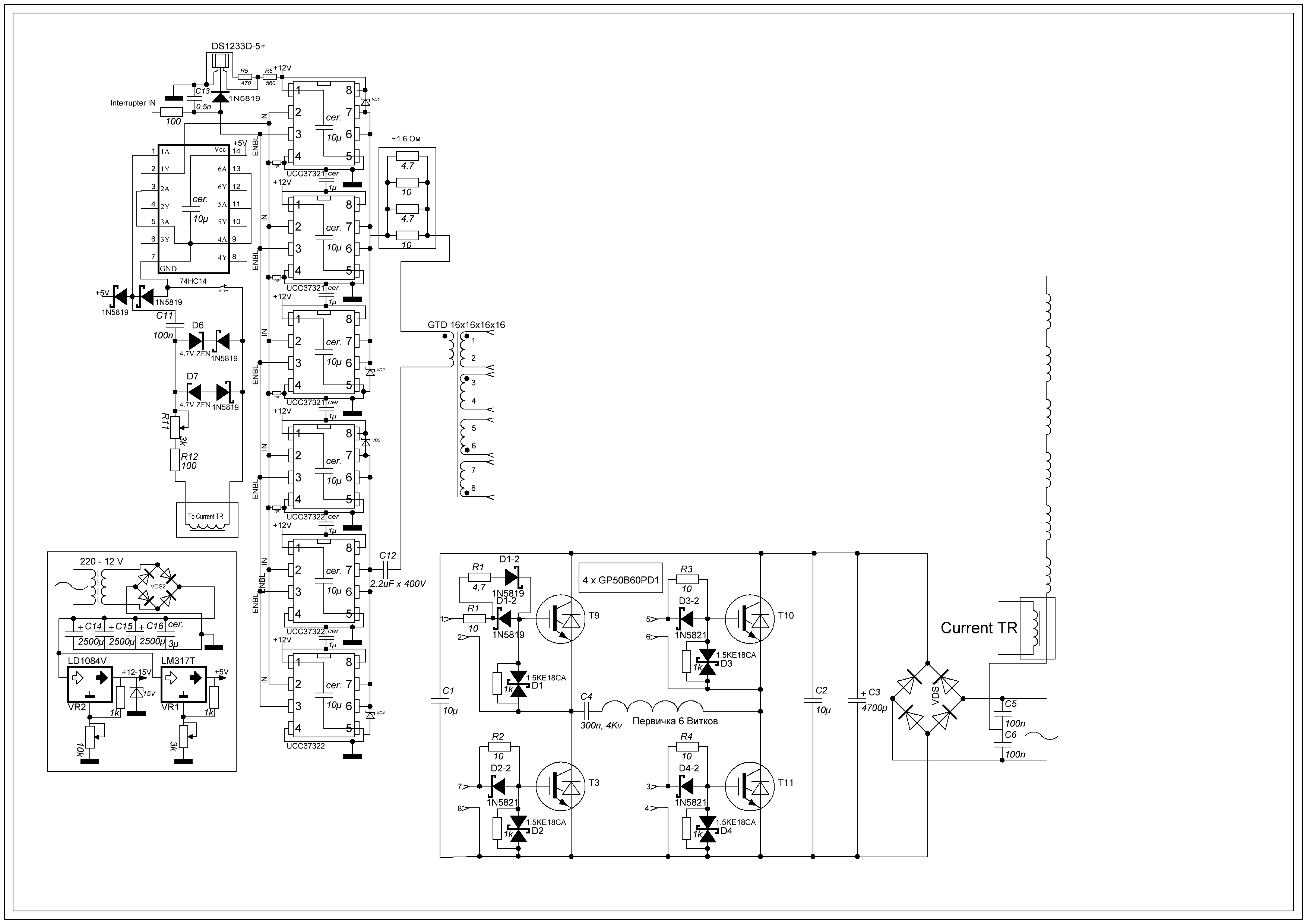 Был проведён маленький эксперимент - Банка заряжалась до 200 вольт, потом понижалось до 50ти, и в то время пока в банке было 200, делал ручной энэйбл, катушка выдавала 5ти сантиметровый злой пыщь, достаточно расширяющийся. Несколько пыщей и работа на холостом ходу - греются только резисторы R -RD цепочек и дроссель в фильтре питания (достаточно ощутимо) и капельку выпрямительный мост. полумосты холодненькие.