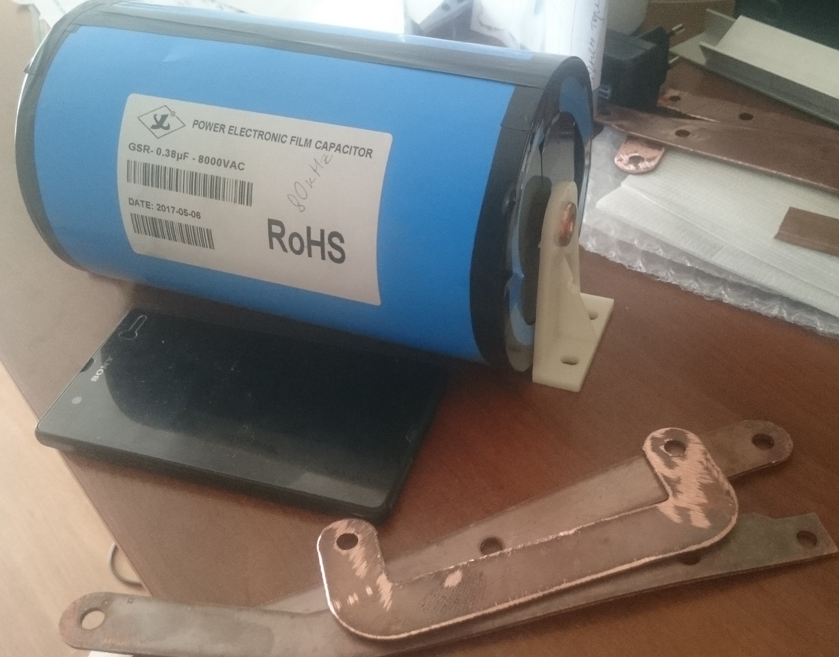Сегодня неожиданно пришел конденсатор 0,38 мкФ, 80КГц, 8000VAC, Iном80А, Iмакс1000А, который встанет вместо батареи ММС согласно советам kaizerpowerelectronics в его калькуляторе и статьях