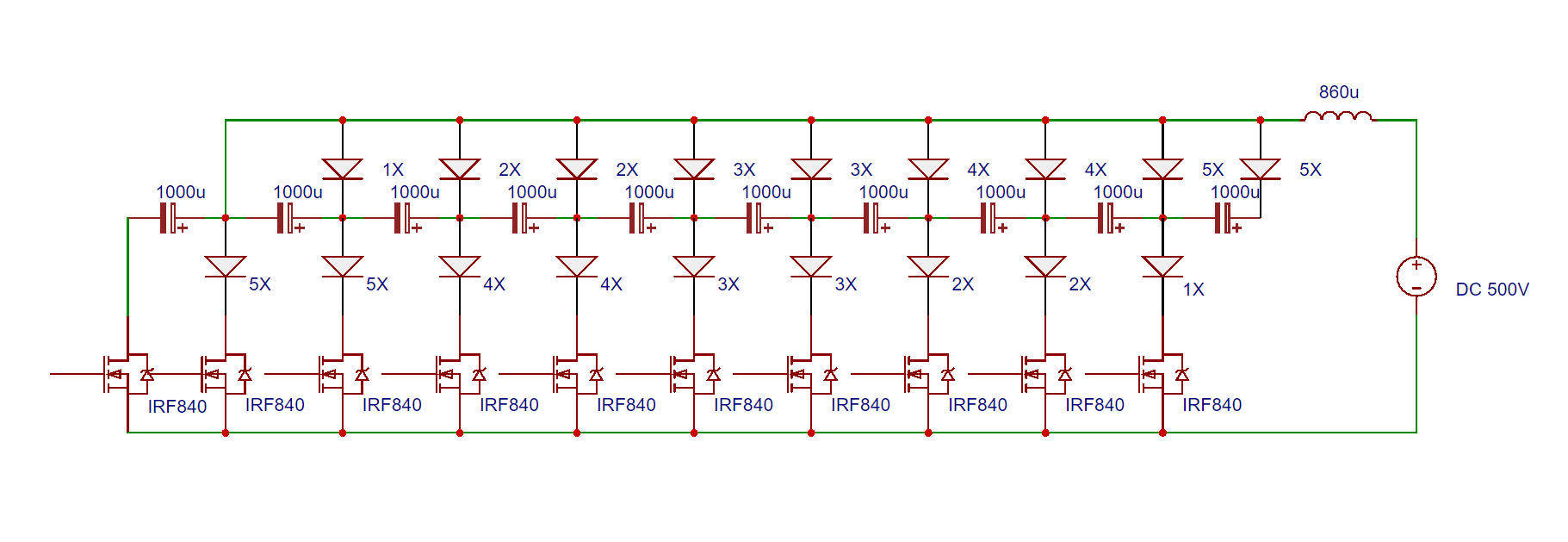Вот так примерно выглядит зарядка конденсаторов, каждый диод это (nX) сборка последовательных диодов HER208 (1000 вольт, 2А). Всю схему рассчитывал под импульсный ток 24А, хоть и преобразователь больше 4А не даст.