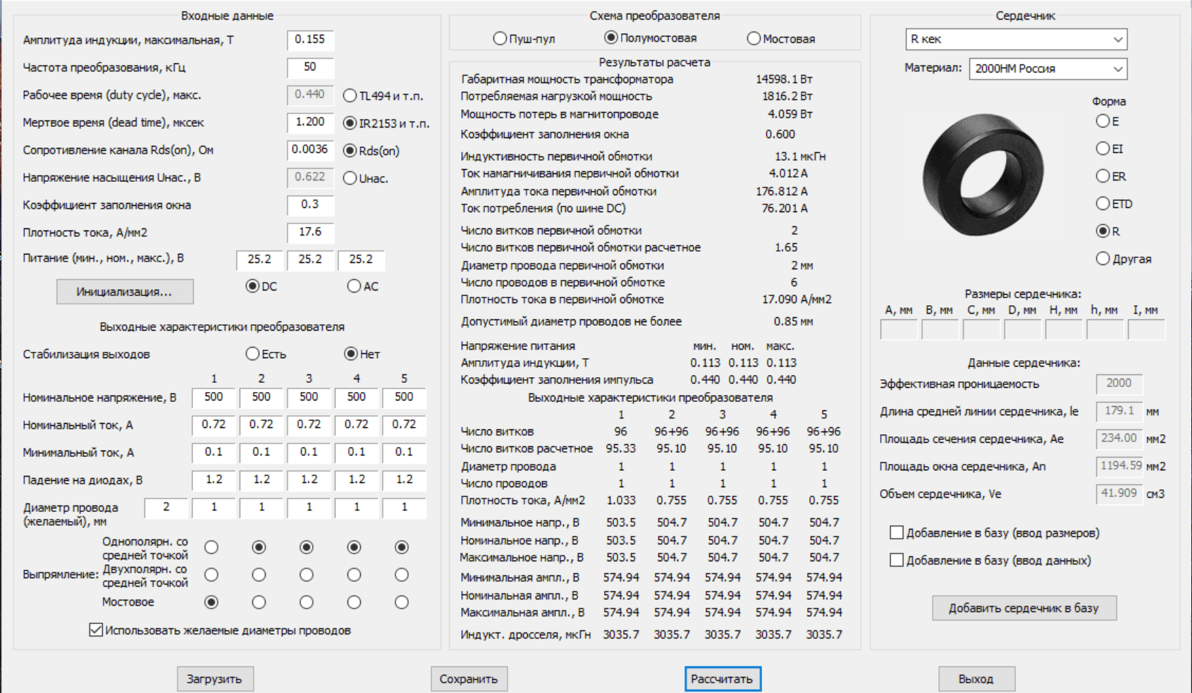 Вот расчёт трансформатора количество обмоток в два раза выше, я только одного не пойму при текущей частоте 50 кГц, индуктивности 13,1 мкГн и ёмкости 4,7 мкФ реактивное сопротивление должно быть не меньше 3,4 ома, с таким сопротивлением и речи о 70А нету. Почему прога считает 1,8кВт выхода?