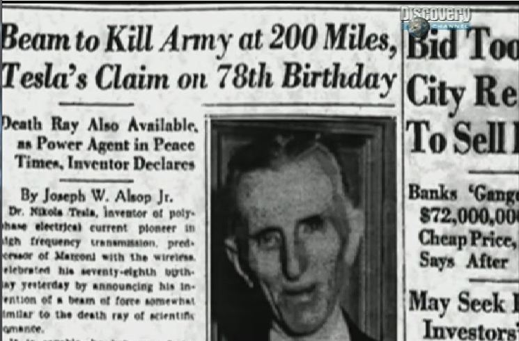 Там проскакивала вот такая картинка из газеты, где сказано мол "на своё 78-летие Тесла заявил что может сделать луч смерти, убивающий армии за 200 миль".