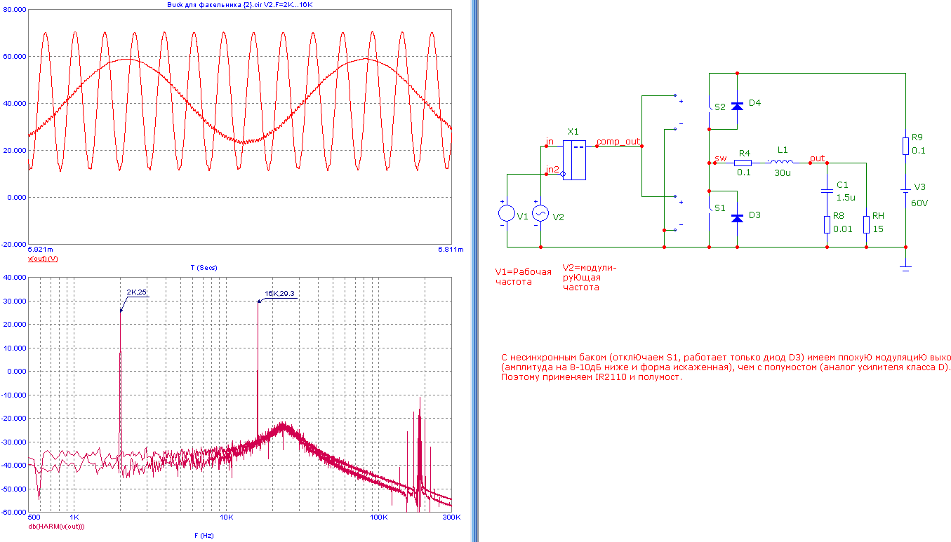 К чемуу это я. А вот к чему. Частоту резонанса LC Нужно сделать хотя бы в 3-5 раз ниже, чем частота ШИМ, чтобы хоть както сгладить пульсации ШИМ и не прокачивать лишний ток через резонансную цепь. С другой стороны горб LC цепи будет также усиливать высокие частоты аудио. Сейчас у меня ШИМ 190кГц, если расчитать LC на резонанс 50кГц при большом токе, то на малом токе индуктивность вырастет и частота упадет до 30кГц, при этом как видно из симуляции аудио с частотой 16кГц будет усиливаться на 4 дБ по сравнению с аудио 2кГц. Более того средний ток через дроссель будет модулировать амплитуду аудио (изза того что горб будет сдвигаться по частоте). А как говорится лучше делать хорошо - плохо само получится