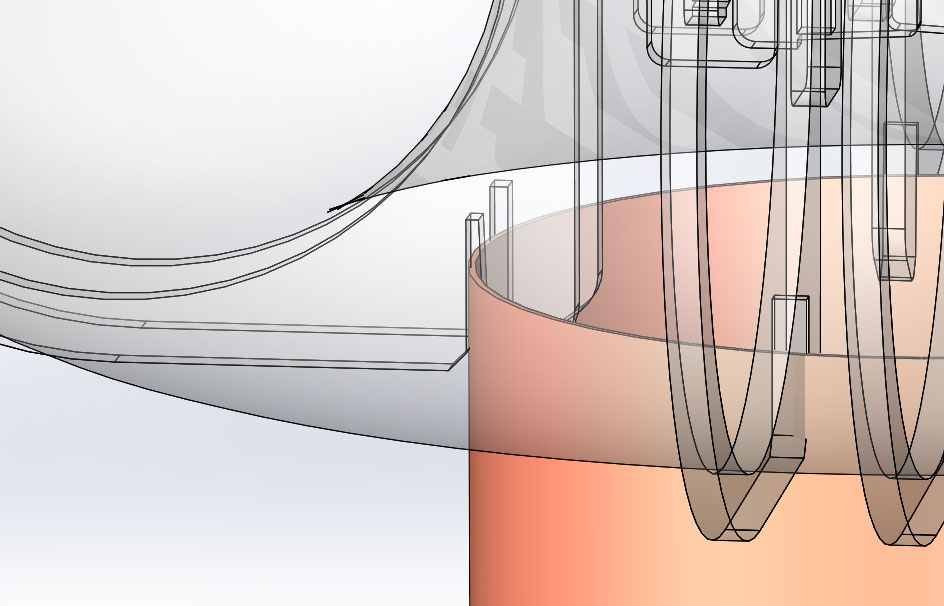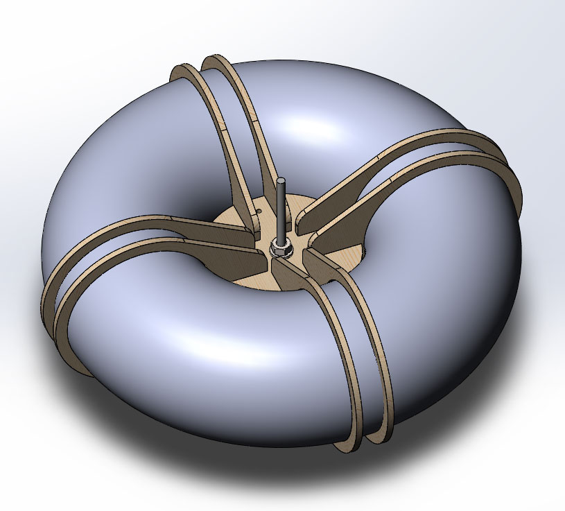 Естественно, мегазадачей был тороид. Смысл в том, что он должен быть предельно дешевым и предельно простым в производстве. Самое дешевое, что можно придумать - гофротруба. Нужно только избавиться от некрасивого шва, который получается при стыковке бублика. Я долго думал, как это сделать. В итоге, придумал двойные ребра, между которыми клеится изолента. Сам тороид тоже склеивается изолентой. В итоге, не понятно где стык, тороид выглядит симметрично и вполне приятно. Тороид собирается за 5 минут, стоит копейки.