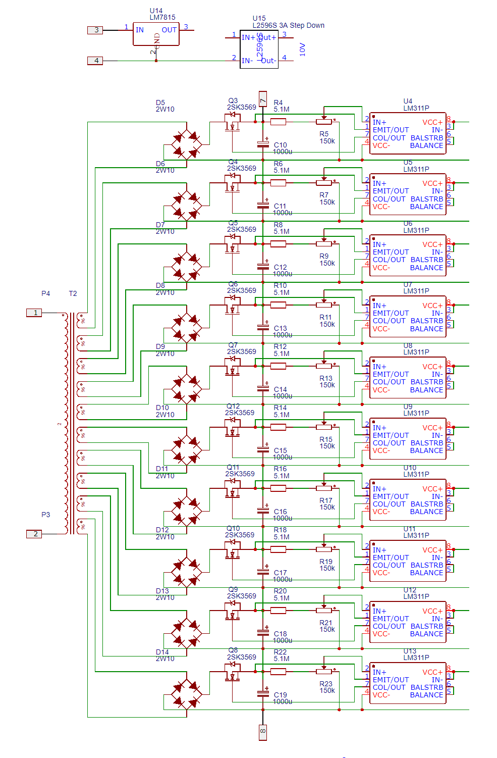 Я решил сделать к каждому кондёру компаратор с делителем на 50 к "логическому -", а на "логический +" ко всем подавать питание от понижающего трансформатора с вольтметром, это позволит в онлайне изменять уровень зарядки батареи.