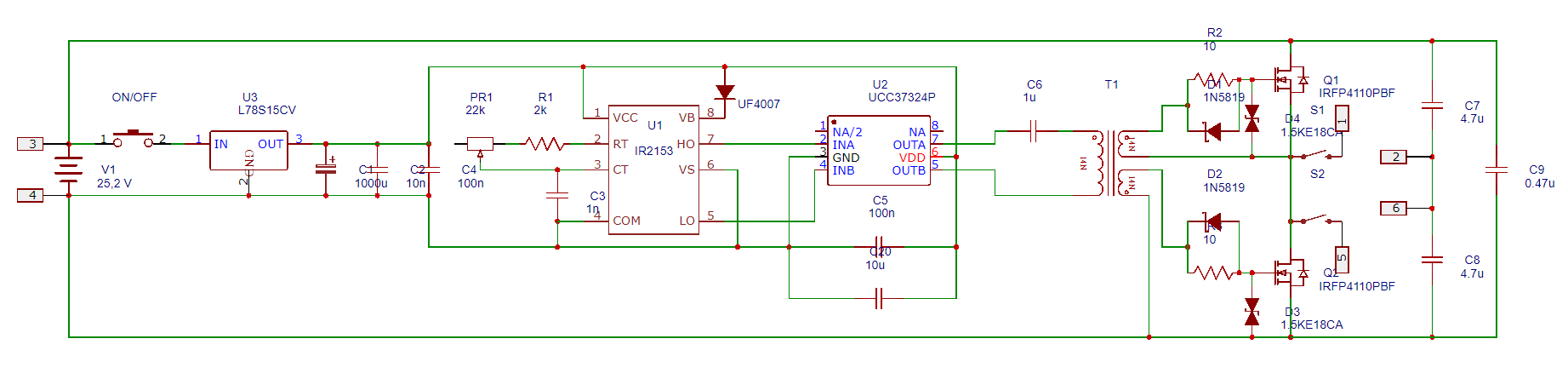 • Полумостовая схема используется при напряжении питания >48В. Зря вы ее делаете на 25В...