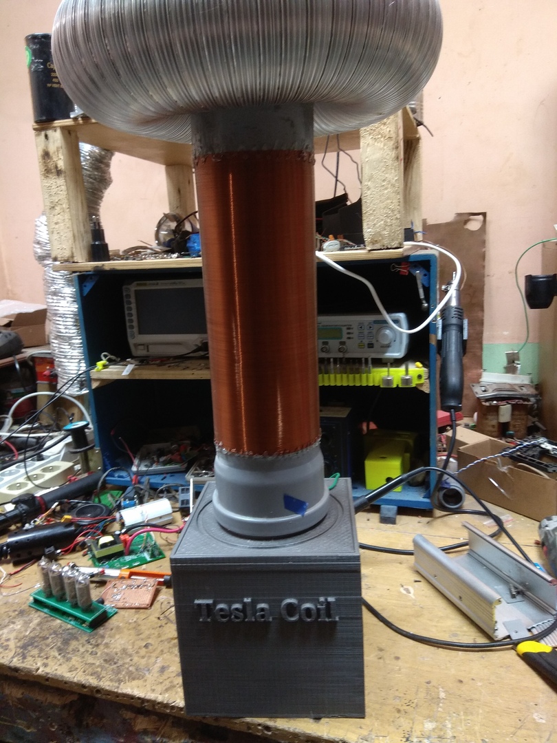 Тороид - обычная гофра для воздуха , диаметром 10 см . На верх трубы намотан на очищенный от лака провод алюминиевый скотч . На верх трубы одета "шапкой" фольга , во избежании коротко замкнутого витка .