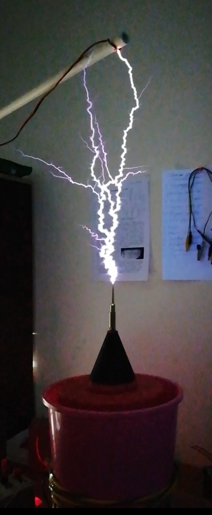 Забыл сказать. Сначала я пропускал разряд конденсатора через сопротивление всей вторички .т.е. присоединял полюс конденсатора к холодному концу. Стример неплохо хлопал но цвет его был желтый и не слишком зрелищный но потом решил усилить эффект и пропустит ток разряда конденсатора напрямую в стример помимо сопротивления вторички. Для этого я присоединил к горячему концу диодный столб, пропустил всю его длину (15 шт. диодов 12 кВ от СВЧ печей) конец его пропустил сквозь тело катушки (черная труба на фото) и вывел снизу на полюс конденсатора а второй конец конденсатора висит над катушкой и в него бьет стример и далее разряжается конденсатор. Без столба хлопает так себе, а вот со столбом стены дрожат и цвет разряда как от фотовспышки…:). Ну в принципе понятно, конденсатор разряжается сразу в стример сопротивление разряда в ионизированном канале пробоя практически на нуле и скорость разряда максимальна, а значит и максимально большое давление нагреваемого воздуха и грохот соответственно и яркость вспышки. Но интересная вещь происходит в которой пока не разобрался. Если стример качера не достает до провода висящего над ним то транзистор иногда горит. Когда конденсатор разряжается со страшным грохотом качер продолжает работать, а вот когда стример не достает до конца провода и конденсатор остается заряженным транзистор качера может сгореть. Непонятно. То есть возникает некая связь палящая транзистор. Наверное на затвор попадает что-то что транзистору не нравится.