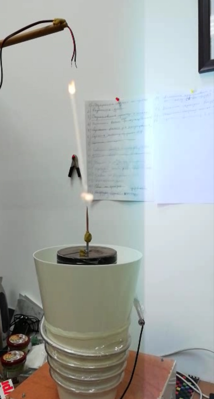 Ставлю на качер пластиковый таз (чтобы не попал на катушку электролит) в центре таза ставлю изолированную чашечку с электролитом и вывожу под слой электролита изолированный проводник с заглублением на конце (точно так же как и в стандартных опытах получения короткоживущего плазмоида). Но нужно и поиграть формой электрода и возможно выводом над электролитом тонюсенького (чтобы испарился от большого тока капа проводничок ну например проволочку нихрома 0,008 мм). Сверху на максимальном расстоянии пробоя располагаю полюс капа, а второй полюс присоединяю к выходу катушки. При включении качера стример достанет до полюса капа над катушкой из электролита родиться короткоживущий плазмоид но он должен подпитываться ВЧ излучением катушки. Возможно он проживет дольше чем стандартный плазмоид в опытах получения "искусственной шаровой молнии", так как описано, что получали плазмоиды подпитывающиеся ВЧ излучением. Конечно надо бы применить высокочастотный девайс типа факельника (или уже близкого к факельнику...). Но ничего этого у меня пока нет, придется делать опыты с тем что есть хотя уже достал мощную радиолампу.