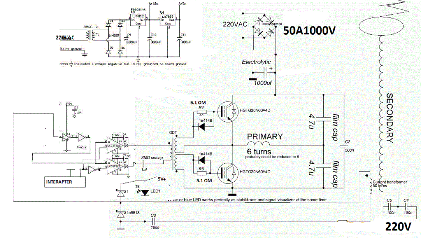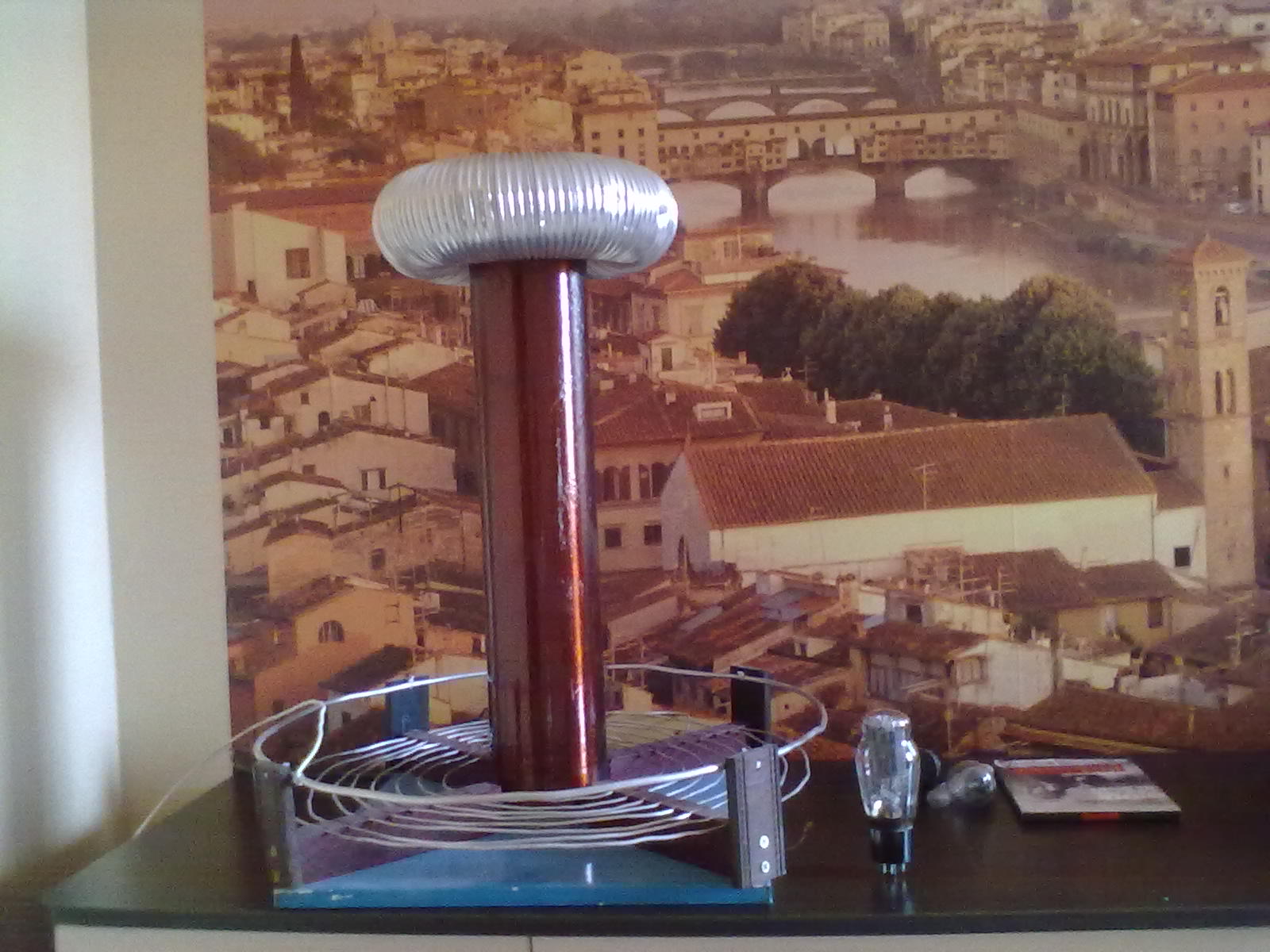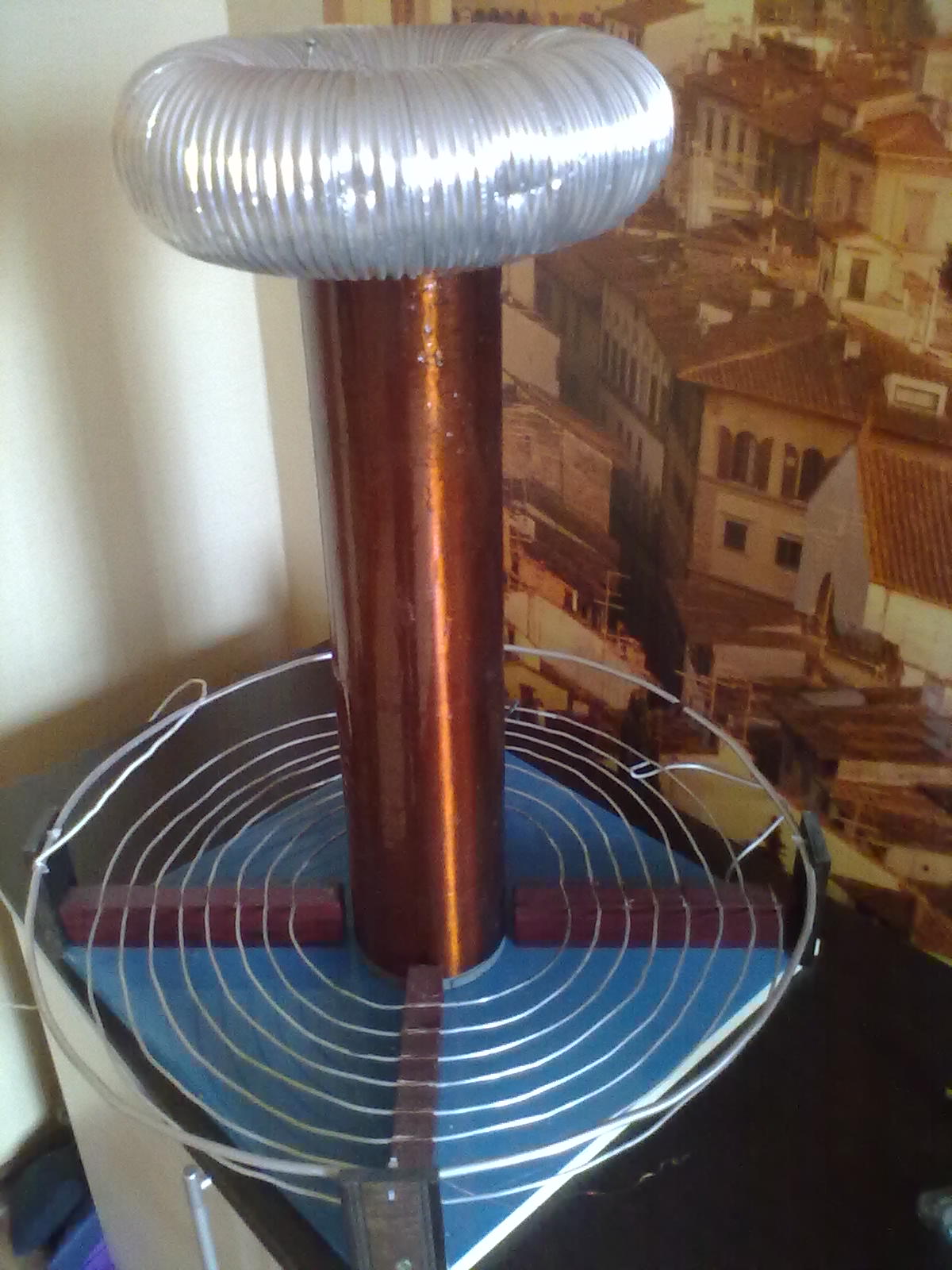 Здравствуйте,я новый пользователь форума и я начинаю работу над SSTC!!!В ходе работы я буду писать и выкладывать фото и видео.Итак,в качестве катушки я буду юзать свою уже намотанную катушку (ранее была сгтц и давала 54см спарки с питанием от мота и удвоителя)Намоточные данные такие:вторичка диаметр 11см на канализационной трубе,проводом 0,32,1500 витков,высота намотки 50см.Первичка плоская,проводом 2,5мм(алюминий)8 витков(скоро перемотаю медной трубкой)Тор из 8ми см гофры,просто надет на трубу(его я тоже подумываю переделать)Силовуха-полумост на игбт(думаю это будут HGTG20n60a4d 600V 70A),ДИОДНЫЙ МОСТ на 50 ампер,конденсатор 1000мкфx400в,ну и конечно же на затворы транзисторов 5,1Ом и 1n5819 и остальная стандартная обвязка.GDT-уже купил витую пару и заказал кольцо epcos n87.Прерыватель уже сделал он элементарный,но это только на первое время,а потом покруче будет с миди(стырил у стива
