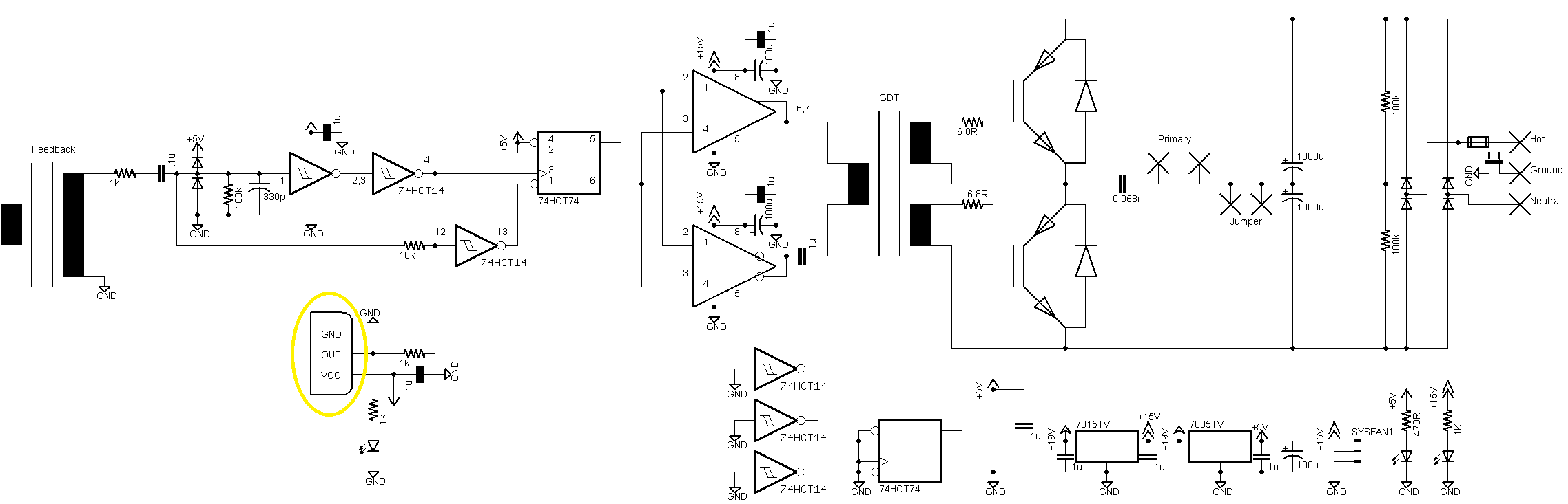 AC/DC писал(а):а зачем на схеме три элемента 74той к минусу подключены?нельзя ли один отсоединить для уццшки?какие примерные намоточные данные у транса ОС?что за клемы ДЖАМПЕР в сил.части?есть ссылки что-бы увидеть работу устройства?куда подключать интеруптер?что ето на схеме я обозначил нипойму некак?