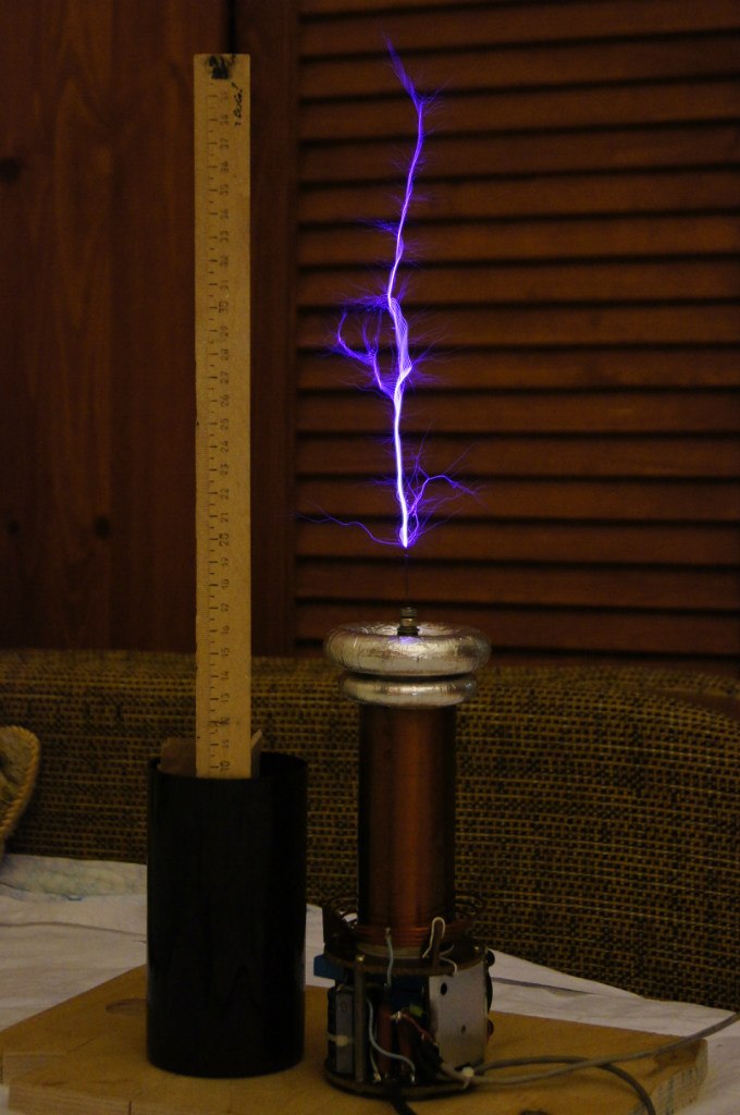 Мне этого показалось мало и я решил переделать ее из SSTC в DRSSTC. Операция прошла успешно: катушка стала обладать двойным резонансом. Но вторичке стало туго... стримеры лезли в первичку отовсюду, откуда могли. Проблему решила пластиковая баночка и каркас от старой погорелой вторички.