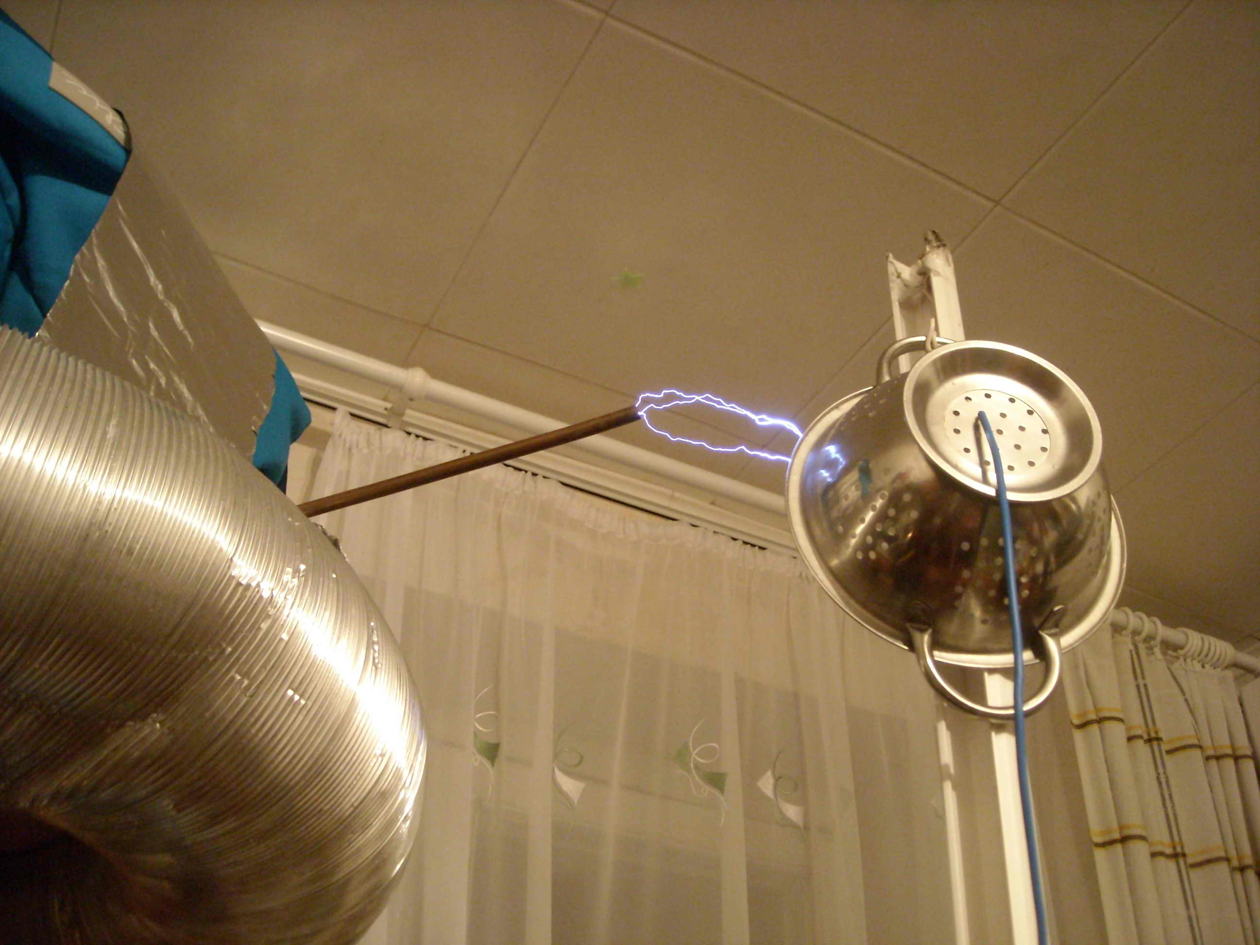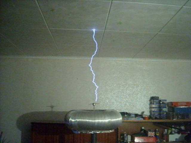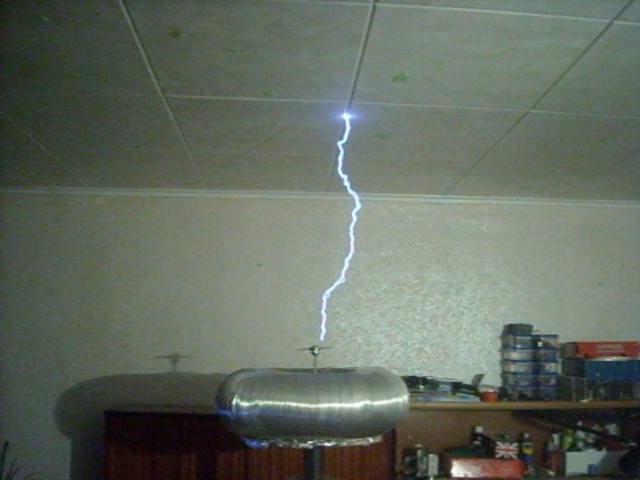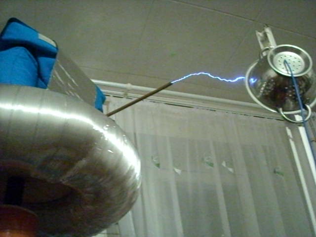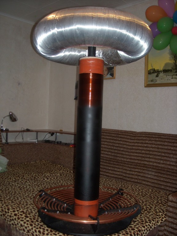 -Первичка та же, лёгким конусом 9 витков ( резонанс на 6.5 витке ), трубой диаметром 12 мм, расстояние между витками 9 мм. Угол наклона конуса небольшой, разница высот между первым витком и точкой резонанса - 4 см.