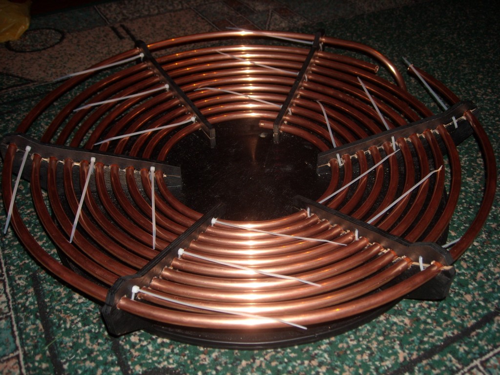 Возможно, изготовлю новую вторичку на 200 трубе и более тонким проводом. Попробуем сначала поиграться с этой. Первичка выполнена медной трубкой 12мм, уложена лёгким конусом и имеет 9 витков.