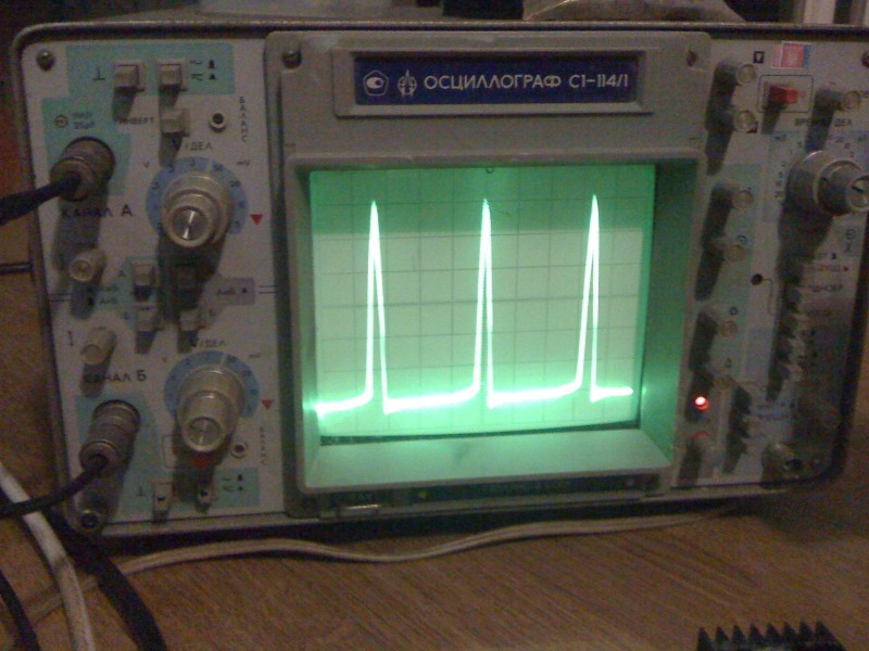 При попытке раздельного питания силовой и управляющей уже нифига не пашет, при любом напряжении на силовой, вплоть до 20В(больше не подавал, а то так уже спалил один транзитор, который ко всему нехило греется при любом напряжении питания в данных условиях)на D-S полевика виднеется вот такая осциллограмма:
