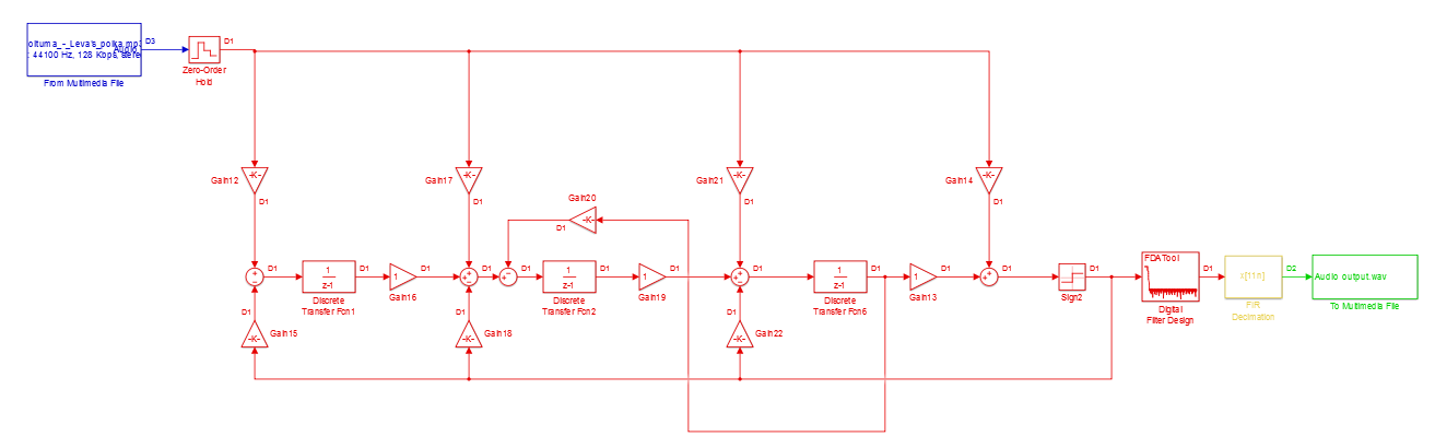 Естественно, первое с чего я начал - это сам модулятор. Если кратко, то весь цимус сигма-дельта модуляторов (по сравнению с ШИМом) в том, что можно отдельно управлять АЧХ сигнала и АЧХ шума, и, таким образом, вытеснить шум в область ультразвука, где его никто и не услышит. Чем больеш порядок модулятора - тем больше можно вытеснить шум в ультразвук, но тем нестабильнее сам моделятор. При любом неловком движении модулятор высокого порядка превращается в генератор.