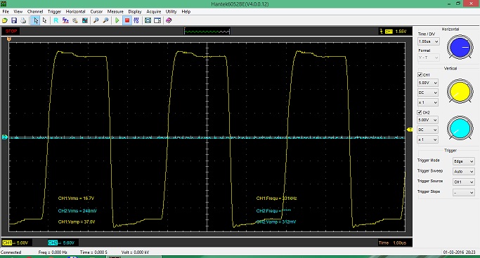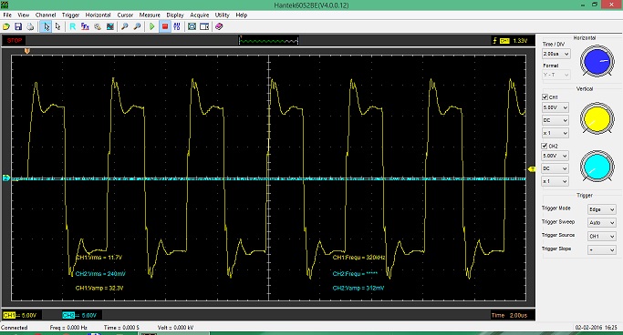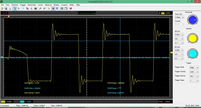 Появились новые вопросы когда стал снимать характеристики сигналов. Без нагрузки при питании от 12вольт сигналы были идеальными, при любом количестве витков ГДТ эксперементировал от 6 до 16, разницы нет.