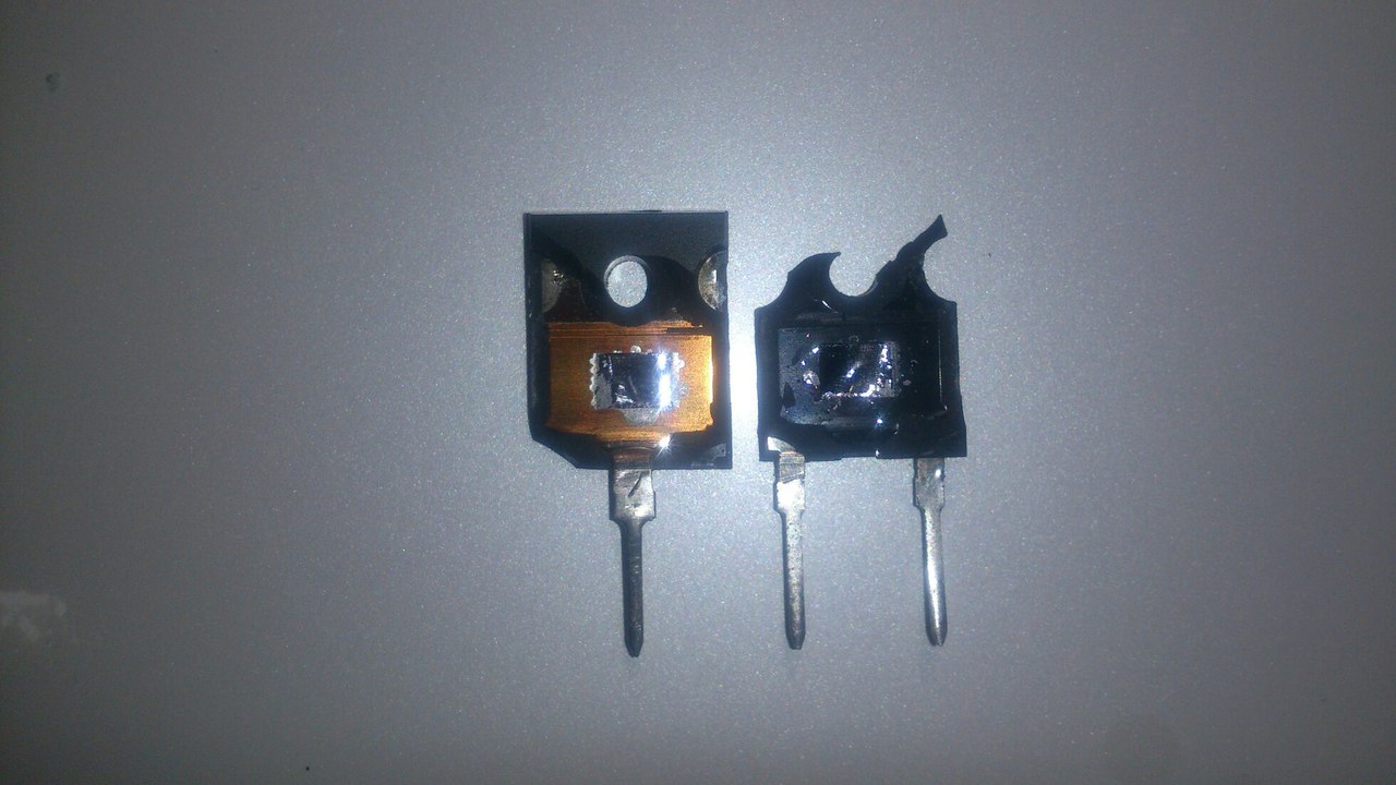 Похоже мне просто везет на поддельные транзиля...на этот раз и вроде все отзывы были хорошие у продавца, и стоили нормально но увы... Нет обратного диода, емкость затвора 1.8нФ, хотя должна быть 3.6... Вскрытие показало наличие лишь одного кристалла, вместо двух положенных.