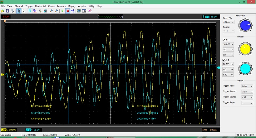 Поигрался с повышением напряжения до 70вольт переменнки, разряды были около 12-13 см, а это уже половина вторки. Далее решил посмотреть работу фазокорректора, крутил переменник, разряды менялись, как звук так и длина. При попытке посмотреть его работу осциллографом, были печальные моменты. один щуп на трансформатор тока с первички, второй на затвор одного из транзисторов... Помехи большие, сдвига фазы не видно, оно и понятно, сигнал то почти один и тотже. Дальше меряю сигнал на затворе отдельно, в попытке найти фазу по уменьшению звона на затворе.. звона я так и не заметил, но заметил сильный, но очень короткий миллер. который при некоторых тактах прерывателья возникал, а при некоторых пропадал, этот миллер сильно отражается на звуке молнии, когда он возникает происходит какой то "пук" вместо "дзынь"))) вот такое гениальное объяснение... Попытки покрутить фазокорректор, иногда почти убирали этот миллер, но изредка, на некоторых тактах интера он всеравно возникает...и при всем при этом ужастно глючит осцилл, и иногда управляющая программа вовсе зависает, приходится перезапускать (судя по всему USB осцилл слабо помехозащищен от таких сильных полей, хотя корпус вроде бы из толстого алюминия)