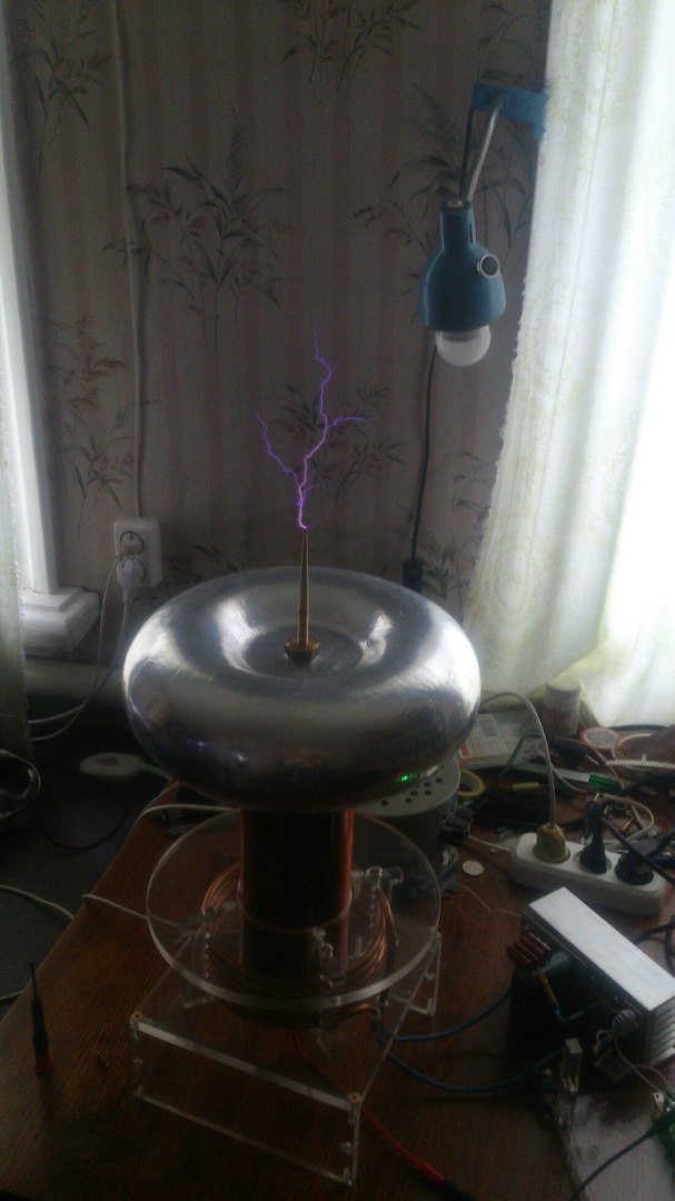 Чтобы тесла была мобильной и разборной, пришлось придумывать как ее отцеплять и прицеплять ко всей конструкции. В итоге сделан большой винт из оргстекла 25мм в диаметре, и с такой же резьбой, этот болт продет сквозь нижнюю крышку вторки, заклеен в ней эпоксидкой. Предварительно в нем сделано отверстие и штыревая клемма, чтобы при вкручивани вторки в корпус(в нем соответствующий разъем мама), автоматически нижний конец вторки заземлялся, в сеть. Терминал соответственно тоже закручивается в верхнюю крышку и притягивается сверху гайкой, тор кладется на терминал, и тоже притягивается гайкой. Все разборное, но на удивление, держится все очень крепко, почти монолит.