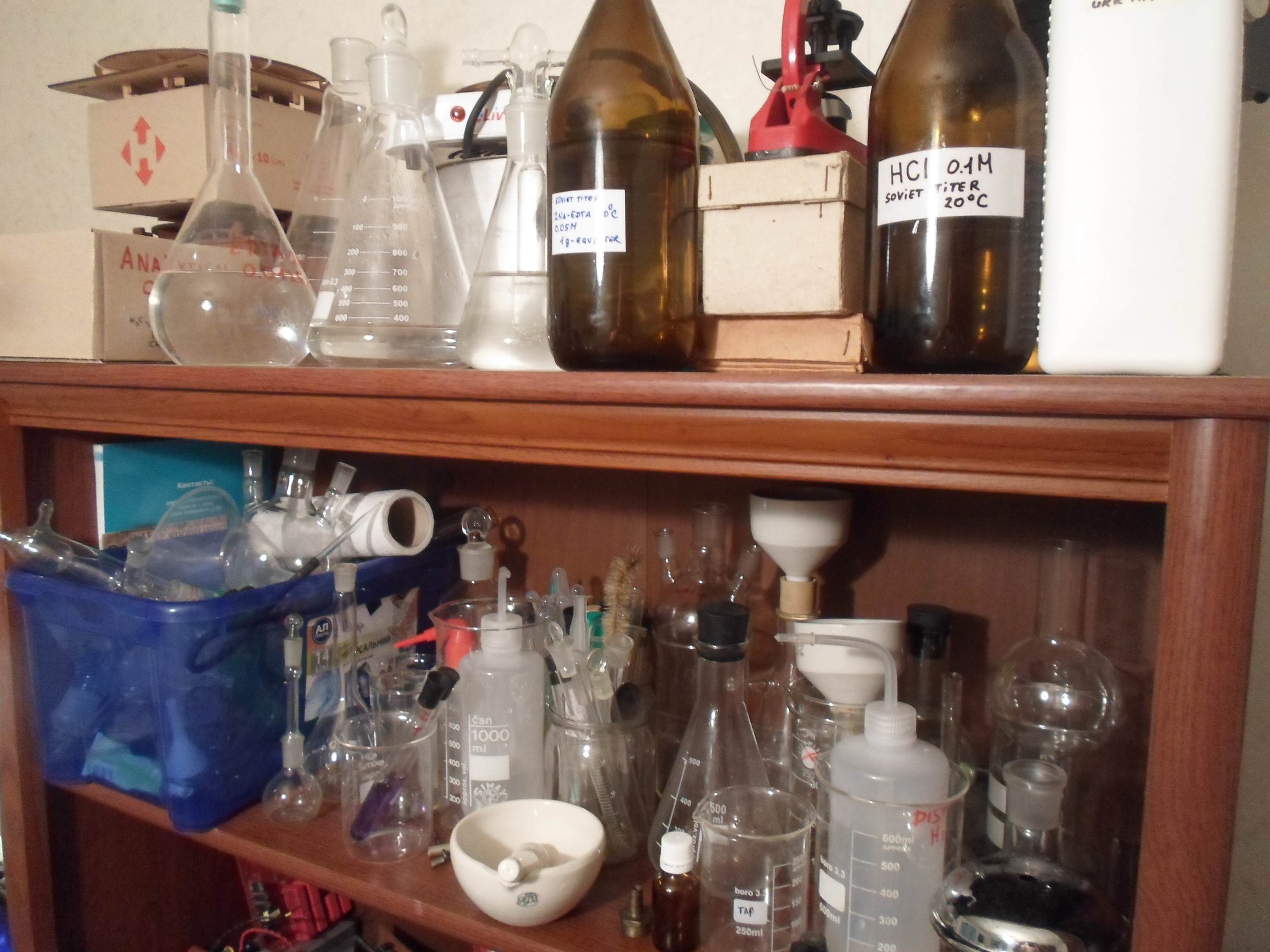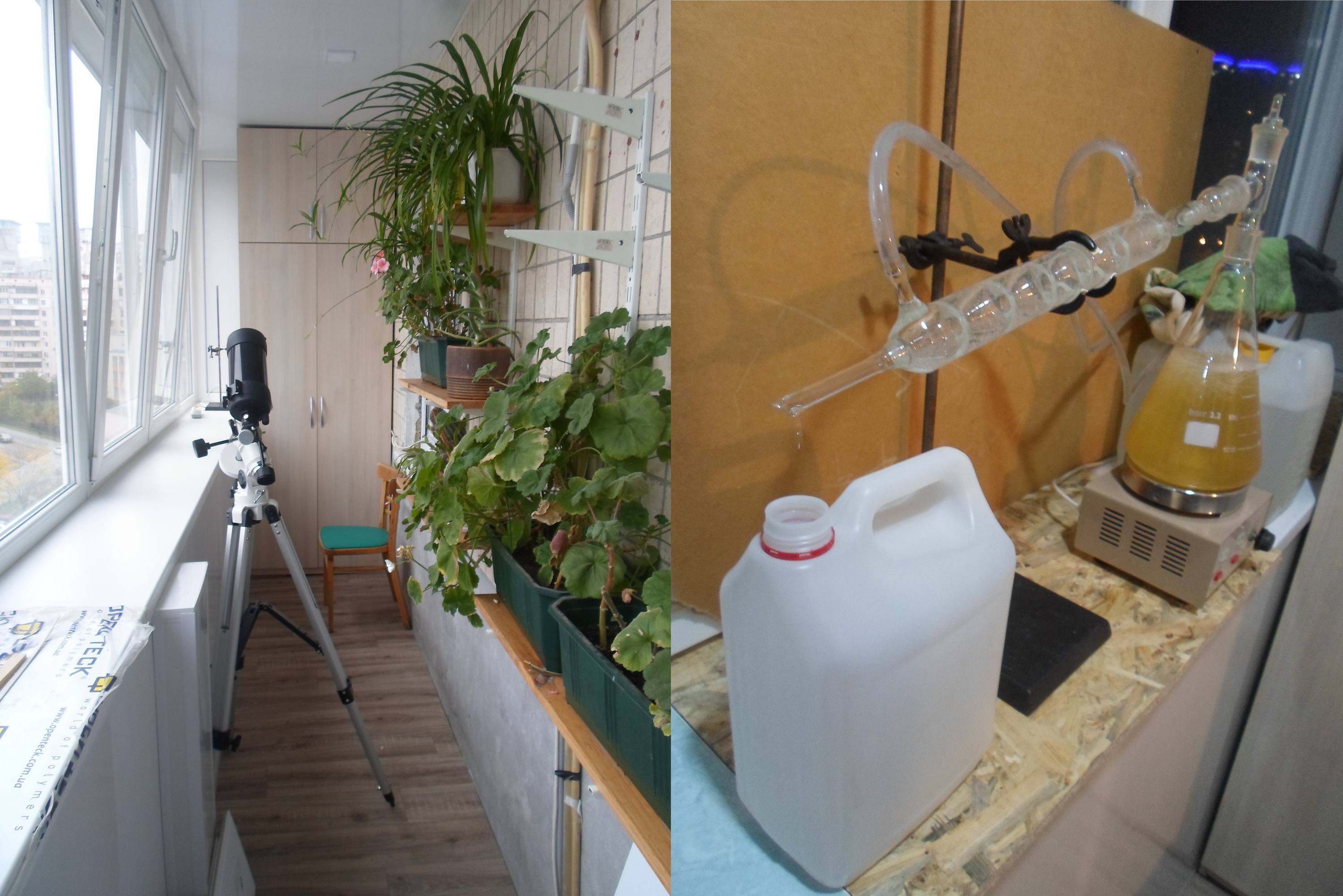 Дома, в довесок к электронной лабе появились ещё и запчасти от лабы химической — несколько полок с посудой, целый шкаф химреактивов, и балконище со взлётной полосой.