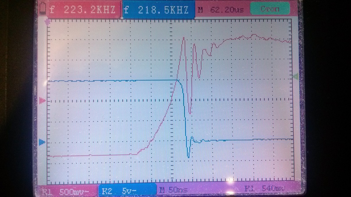 Ситуация действительно улучшилась , но всё равно выброс присутствует и эта мысль о сквозняках навела меня на мысль посмотреть что вообще происходит до затвора. Ну выход с драйвера обеспечивает хороший фронт к нему вопросов нет.
