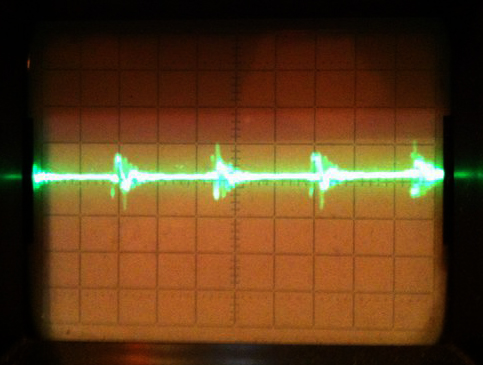 Но потом обратил внимание что на затворном резисторе висят какие то помехи, тот факт что резистор и металоксидный заставил меня усомниться в его проблеме сотворить подобные явления. Выяснилось что такие помехи висят на всей средней линии (на истоке верхнего кирпича) и представляют собой это: