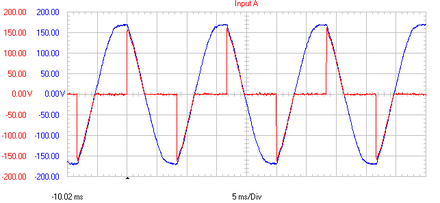 Вот так выглядит напряжение на выходе у диммеров, синий — синусоида в розетке, красный — как она режется тиристором: