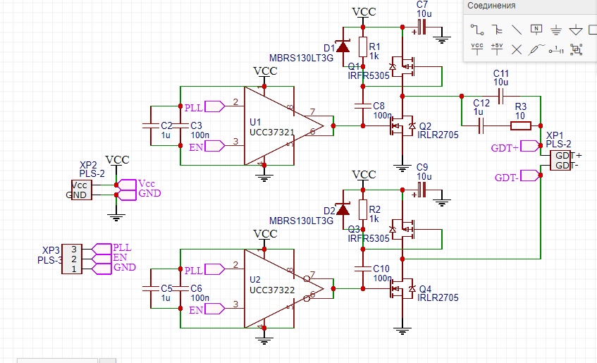 Pigball писал(а):12 вольт на GDT чрезвычайно мало. Чем выше напряжение - тем меньше шумов. Повышай напряжение, регулируй витками GDT чтоб на затворах силовой не превышать datasheet.