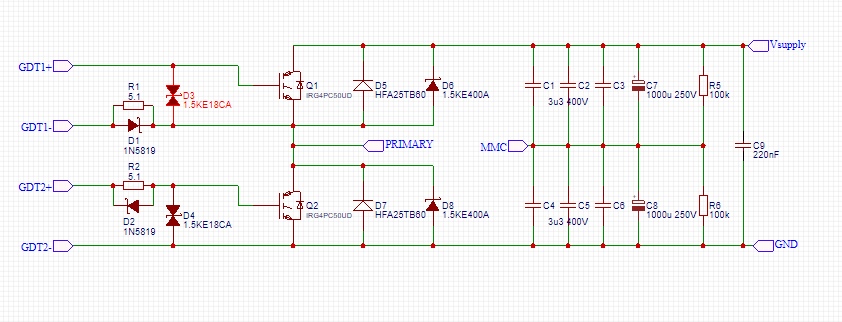 Здравствуйте! Я новичок в тесластроении (собираю с января 2018г) и очень необходимо решить проблему с GDT - высокочастотные колебания во время зарядки затвора 50b60, которые начинаются с выброса от миллера. Откуда они берутся и как их подавить? Щуп от осциллографа длинный 10x (нет пока возможности добыть короткий) на 200МГц (осциллограф тоже на 200, hantek dso6204bc). Прикладываю схему драйвера GDT (прошу не акцентировать внимание на то, что мостом полевиков драйвера управляют ucc-ки, они у меня горели при прямом управлении GDT)