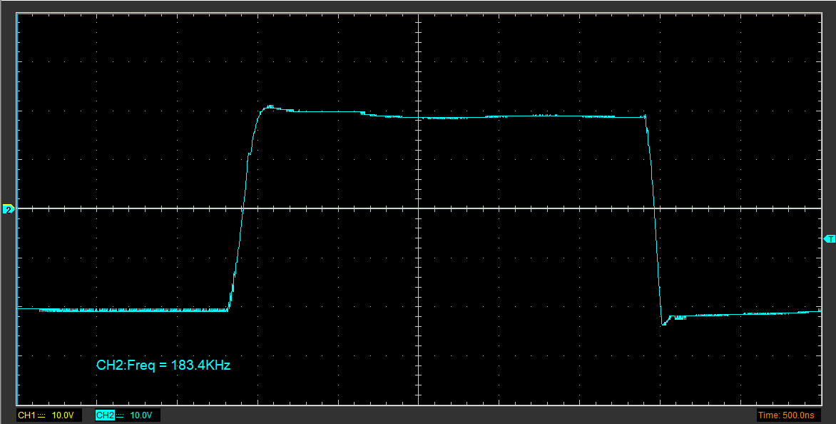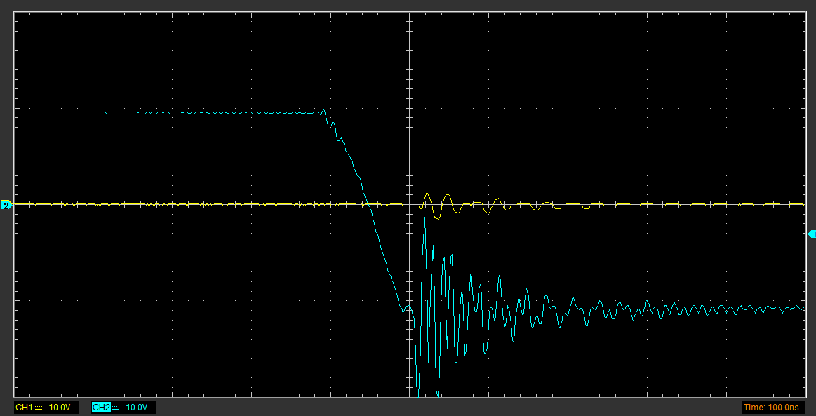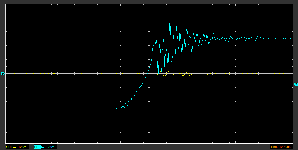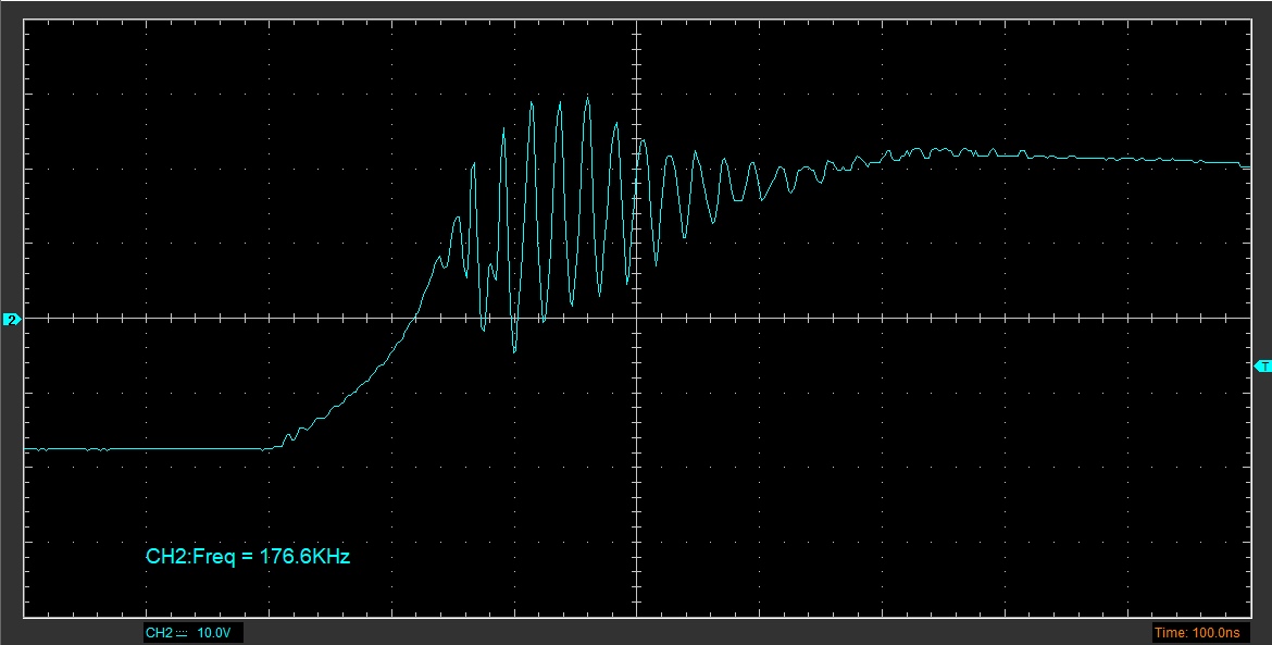 К сожалению, это никак не повлияло на наличие паразитных колебаний, они даже меньше не стали, но зато теперь переключение довольно быстрое - 230нс нарастающий фронт и 120 ниспадающий. Новые параметры GDT - 7 витков в первичной, 1:1. При 0В на силовой всё красиво, но при 100В на силовой всё плохо, нагрузка не подключена. Осциллограммы приложены. Судя по ним, колебания возникают только при нарастающем фронте после выброса от эффекта миллера и проходят через GDT на другой транзистор, что создаёт сильную помеху последнему при закрытии. Никак не могу понять, как избавиться или хотя бы приглушить эти колебания. Их частота составляет 10-ки МГц, осциллограф рассчитан на 200МГц.