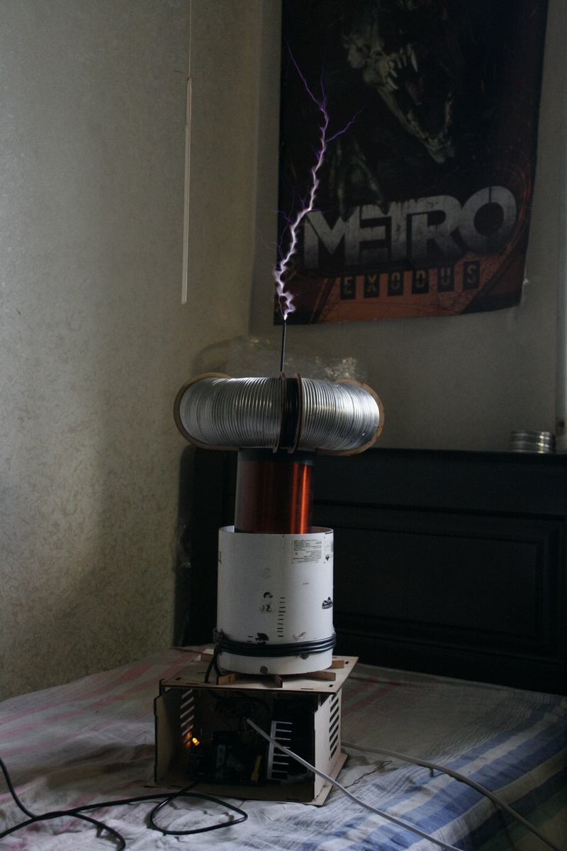 По стримеру " в пространство" считать напряжение нельзя имхо. Считать корректно по состоявшемуся (яркому и звуковому) искровому разряду между двумя концами катушки. По ГОСТу напряжение определяется по длине искрового разряда только между ДВУМЯ ЭЛЕКТРОДАМИ. По длине спарка между "spark point" (второй конец обмотки). Так будет более верно. При опытах на своей Тесле я заметил, что длина стримера сильно превышает длину именно спарка между "spark point" и землей. Длина спарка "spark point"-земля не более 1-1,2 м. а стример достигает длины более 1,5 м легко. Вероятно тут дело в механизме сходном с работой QCW c подпиткой стримера, либо в увеличивающейся ионизации воздуха вокруг терминала. А вот истинное напряжение в пике это именно длина спарка "spark point"-земля. Не утверждаю конечно но вот такие предположения.