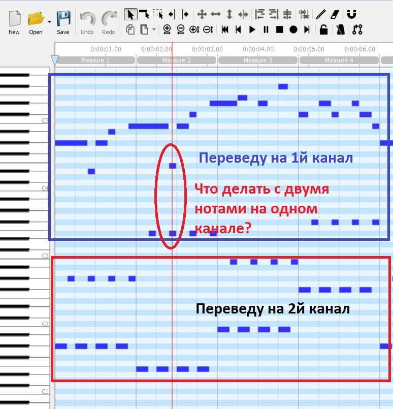 3. Если есть простая и хорошо звучащая мелодия, но ноты разбросаны по двум-трем каналам — можно отредагить вот в этой проге, она супер-простая: http://midieditor.sourceforge.net/