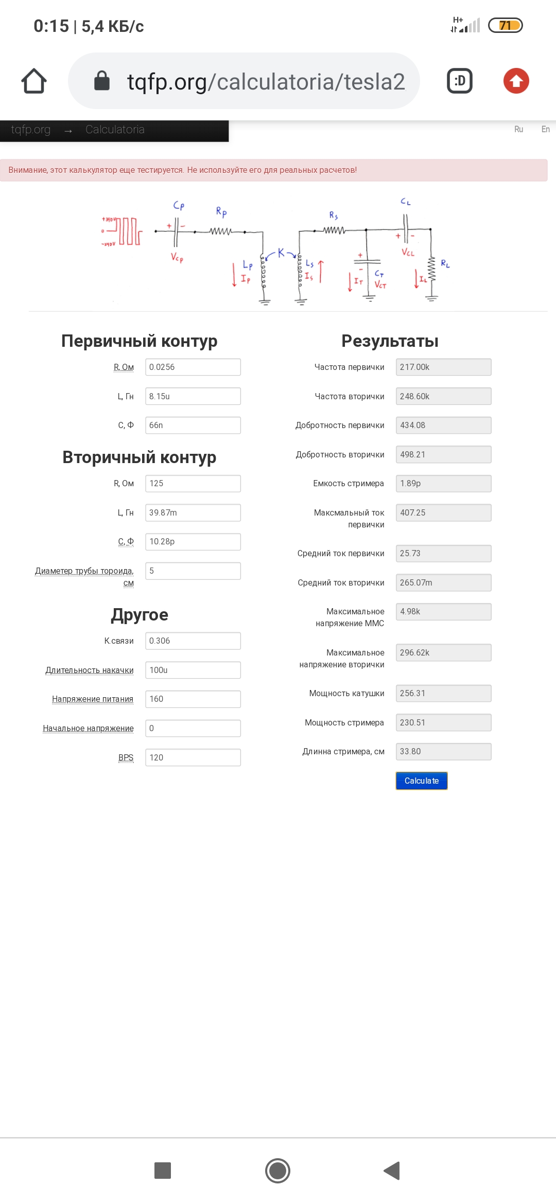 На счет музыки не знаю, мне больше звук Dr нравится! Я тут посмотрел Ваше видео про полюса в тесле и у меня вот вопрос! В КАЛЬКуляторе пишет частота Нижнего полюса 201кгц, но как я не пытаюсь настроить первичку в калькуляторе на эту частоту, эта частота полюсов уплывает! Что я делаю не так?