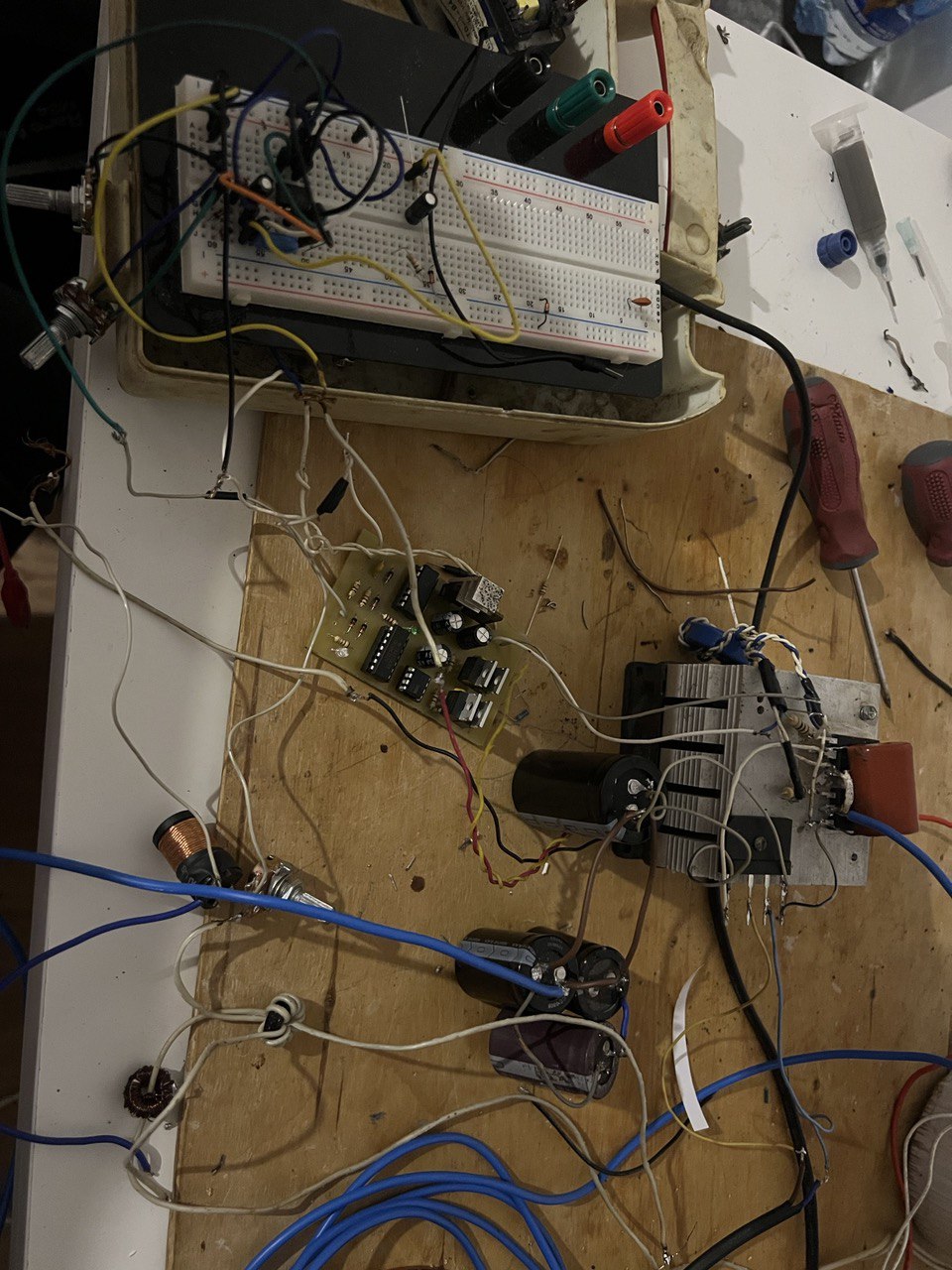 Получаю красивые мечевидные стримеры до 20 см, но только при подключении внешнего генератора (есть в моем осциллографе), выставляю на нем около 410 kHz и тогда красота и глаз радуется, а если подключить обратную связь то генерация видимо происходит на гармонике с меньшей частотой и стриммер - жалкие 8-10 см, пробовал и антенну и ТТ, но не помогает, как можно решить эту проблему? Кстати в таком режиме стример норовит ударить в середину катушки. Планы
