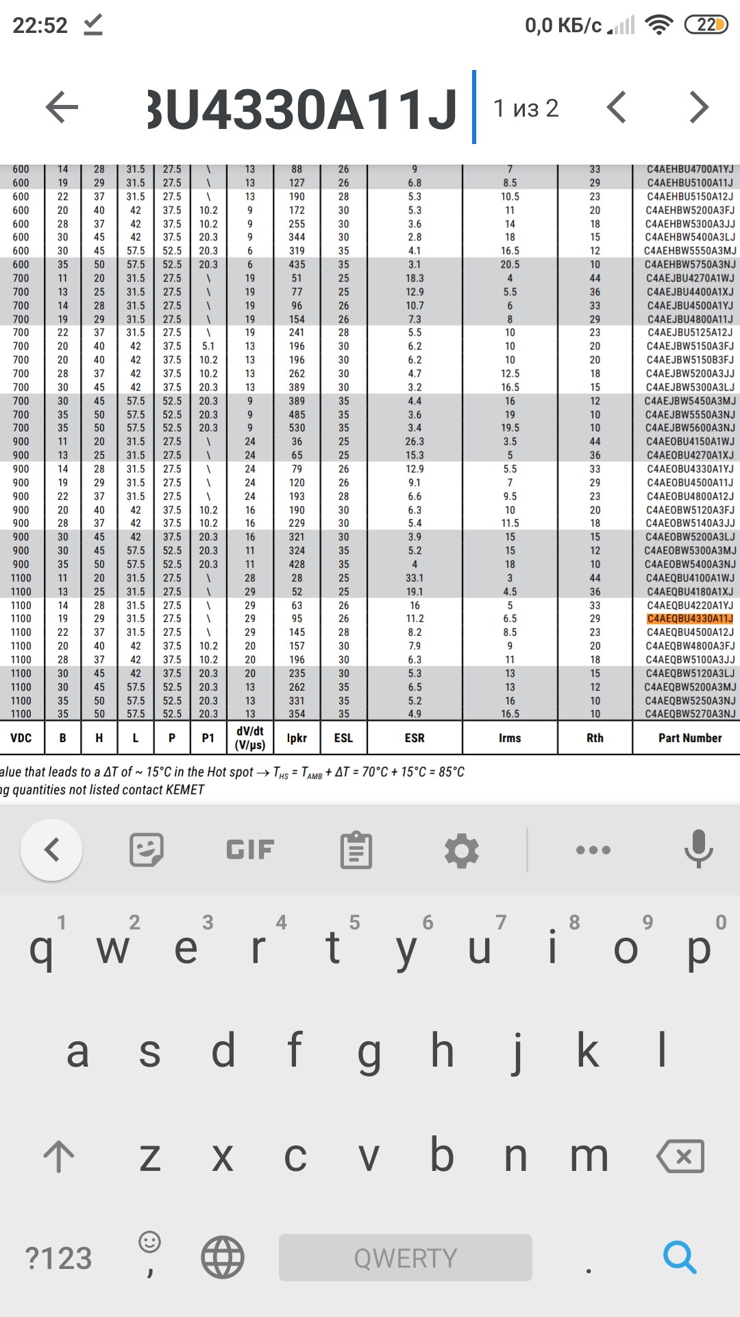 Добрый вечер.Вопрос Евгению И ДРУГИМ ЗНАТОКАМ, ТАКАЯ ПЛЕНКА ОТ KEMET C4AEQBU4330A11J В ФИЛЬТР НА МОСТ ПОДОЙДЕТ? На форуме мало обсуждался такой вопрос и хотелось бы знать по каким критериям делается выбор и вот эта серия C4A конкретно -например если сравнить с серией R76 то разница dV/dt есть на порядок быстрее у R76, или посоветуйте другие капы,