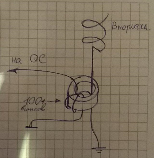 С первым вариантом первички и антенной катушка не заработала, но был слышен гул и чем ближе приближать антенну к вторичке тем он сильнее. Вплоть до того что в один момент пробило примерно со средины вторички на антенну. Стримеров так и не было. Неонка светилась, но наиболее яркое свечение было именно по средине катушки и к краям яркость падала вплоть до того что неонка переставала светиться (над тором неонка не светилась). Стало понятно что не хватает обратной связи (Ну мне так показалось). Начал экспериментировать с ТТ. Намотал 50 витков подключил немного изменив схему обратной связи (Сделал как на схемах с ТТ). Стал проверять но результата совсем не было. Вернулся к антенне - всё как и прежде. То есть тоже очень слабо((((