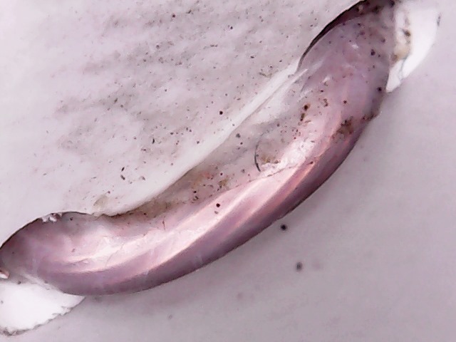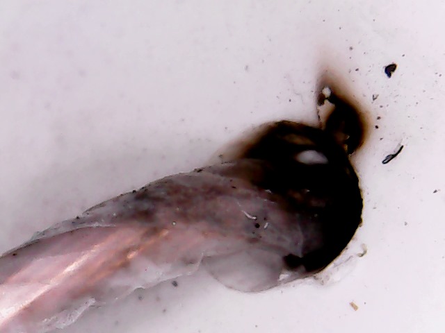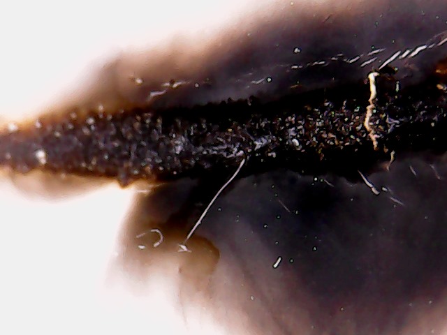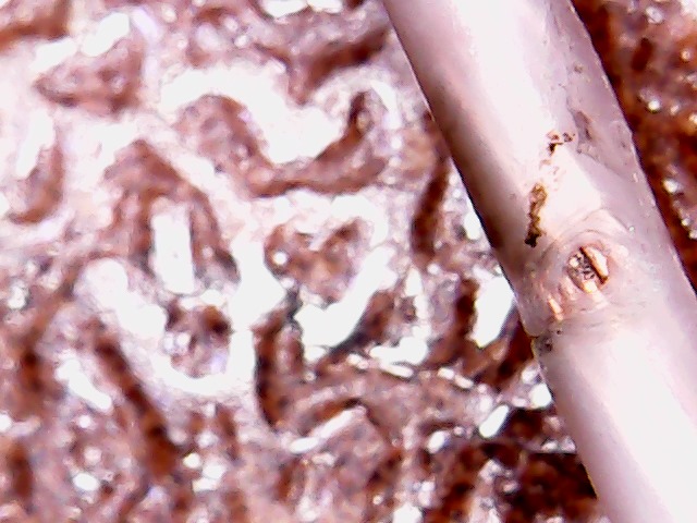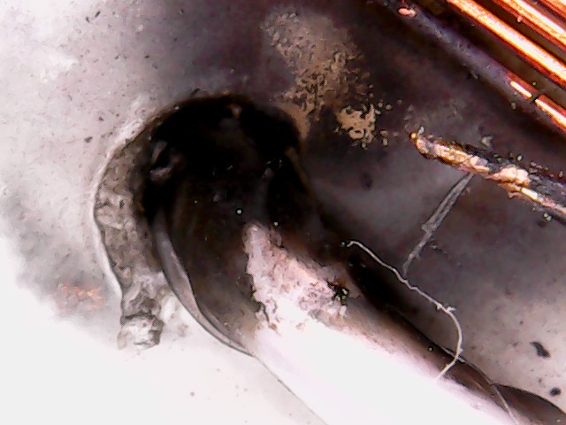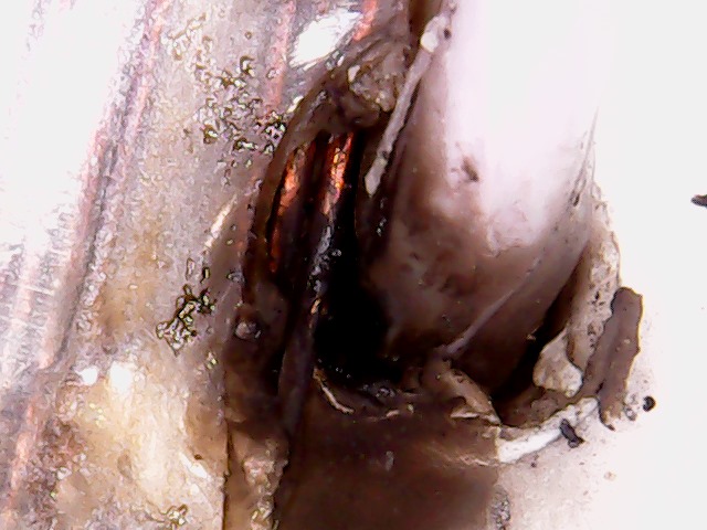 С внутренней стороны трубы один полноценный прожег пластика и пара "чиркашей" + есть локальные вспученности (на 4 фото чуть-чуть видно этот гриб, который не смог прорвать слой пластика), т.е. там изнутри явно что-то подогревало, но наружу не успело выйти.