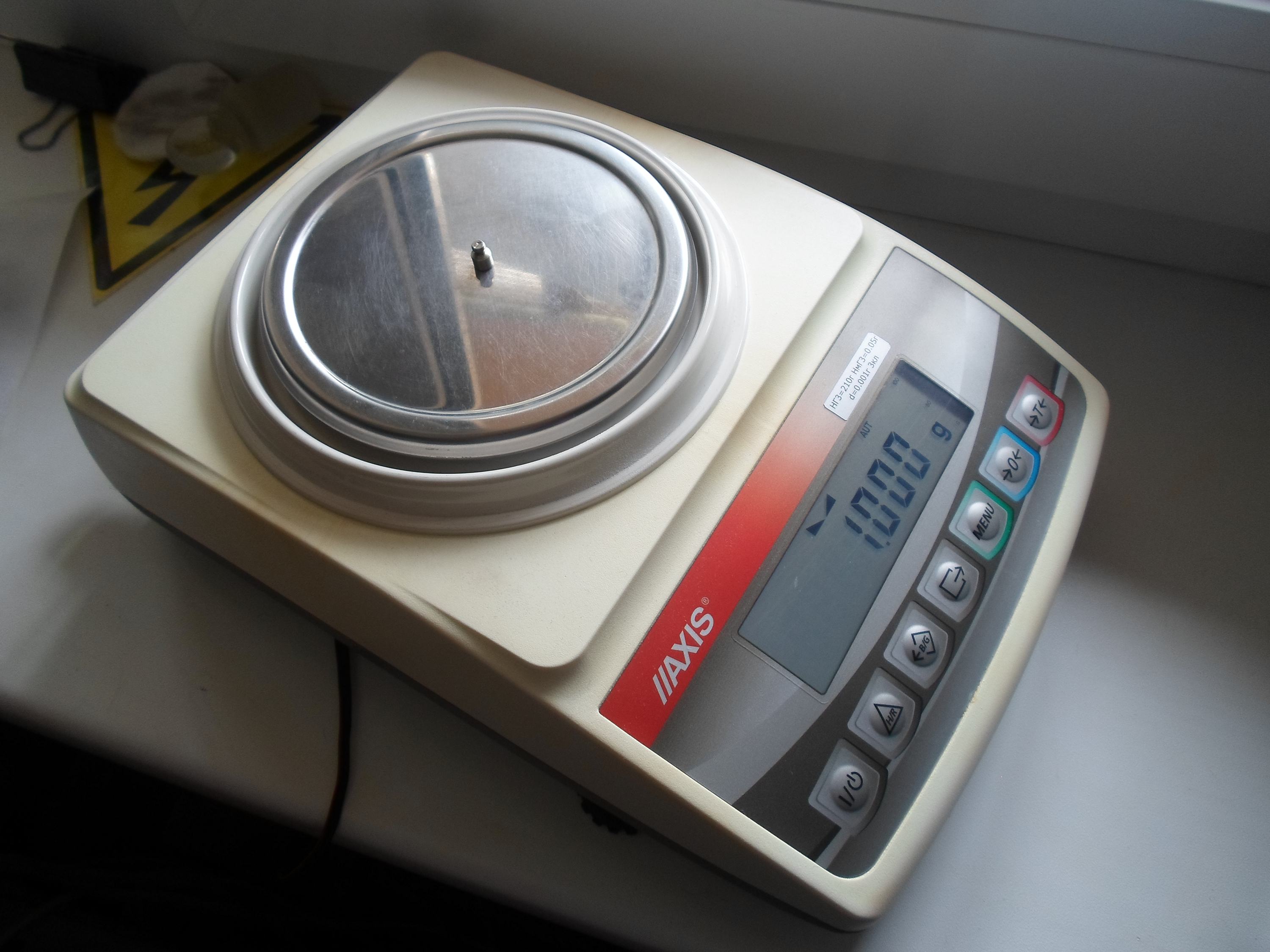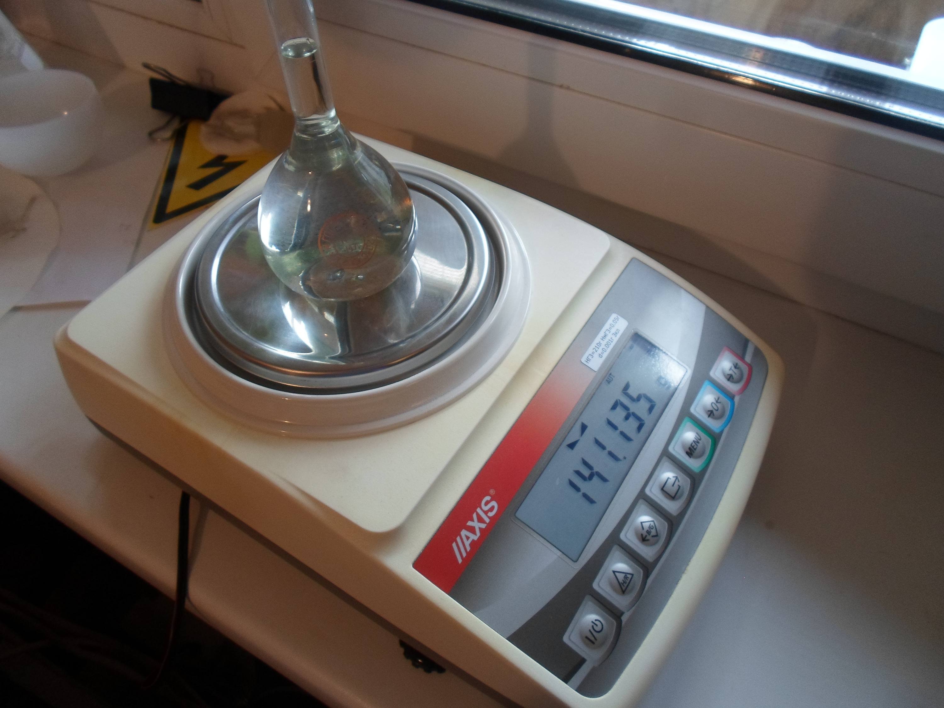 Я забыл отнять вес тары(лаб. мерной колбы на 100 мл), но он у меня записан — 34.050 грамм.