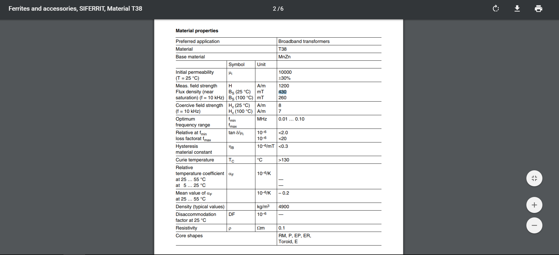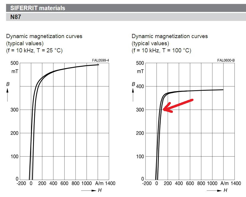 https://www.tdk-electronics.tdk.com/dow ... df-n87.pdfОднако ввести его в калькулятор будет неправильно, ибо как минимум это значение для 25-ти градусов Цельсия, а при 100 градусах оно уже падает до 390 мТ. И это ещё не всё.
