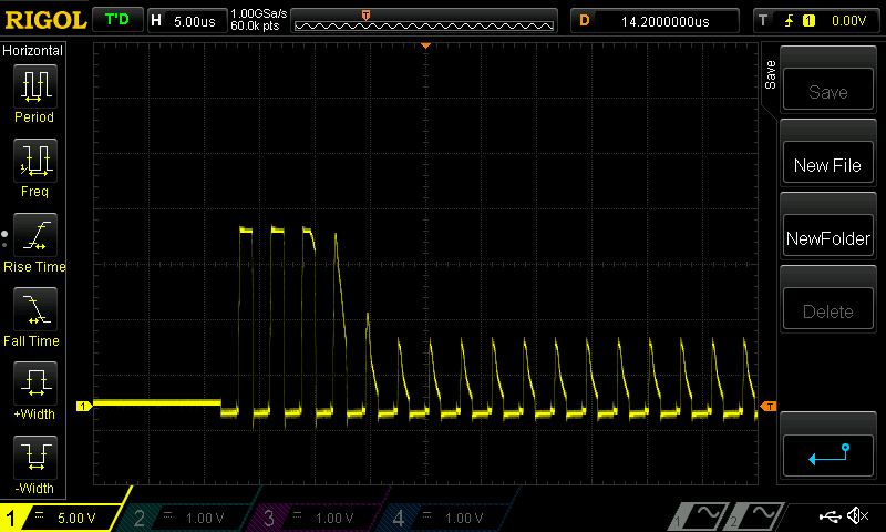 ЗЗЫ: Домотал витков, "хороших" импульсов стало побольше, но, понятное дело, работать это не будет. Даже девять витков не решили проблему. Считалка показывала мне вообще два витка. Очень похоже на насыщение, но не может же так сильно расходиться результат с теоретическим. Кольцо стандартное 25x14x10 n87. Интересно, бывают ли палёные кольца, на моём с одной стороны краска лежит далеко не идеально.